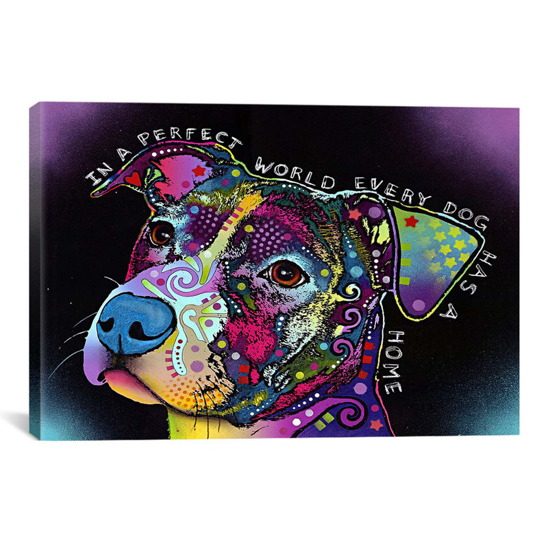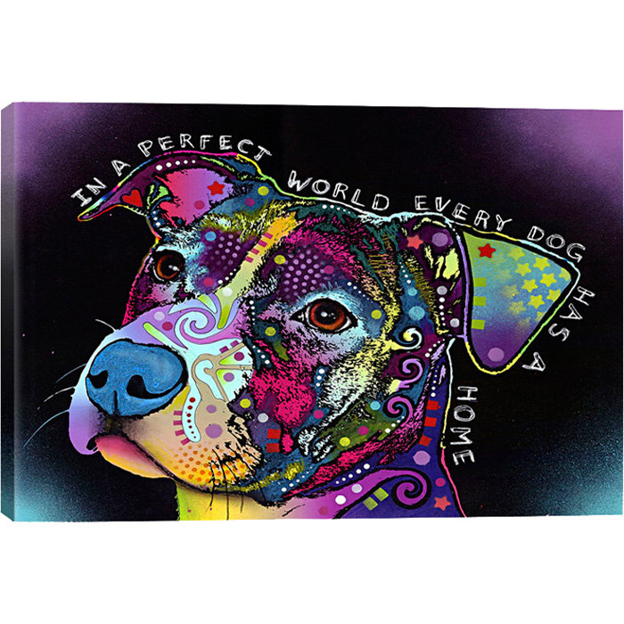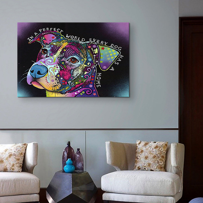 An unorthodox dog motif is front and center with this statement-making 100% cotton canvas print, handcrafted in the United States. A vibrant mix of geometric details and bold colors gives this canvas print its distinctive look, while a typographic message rounds out the design in a pop of pattern. This clean-lined rectangular print comes equipped with hanging accessories and is available in a variety of sizes to fit any space.