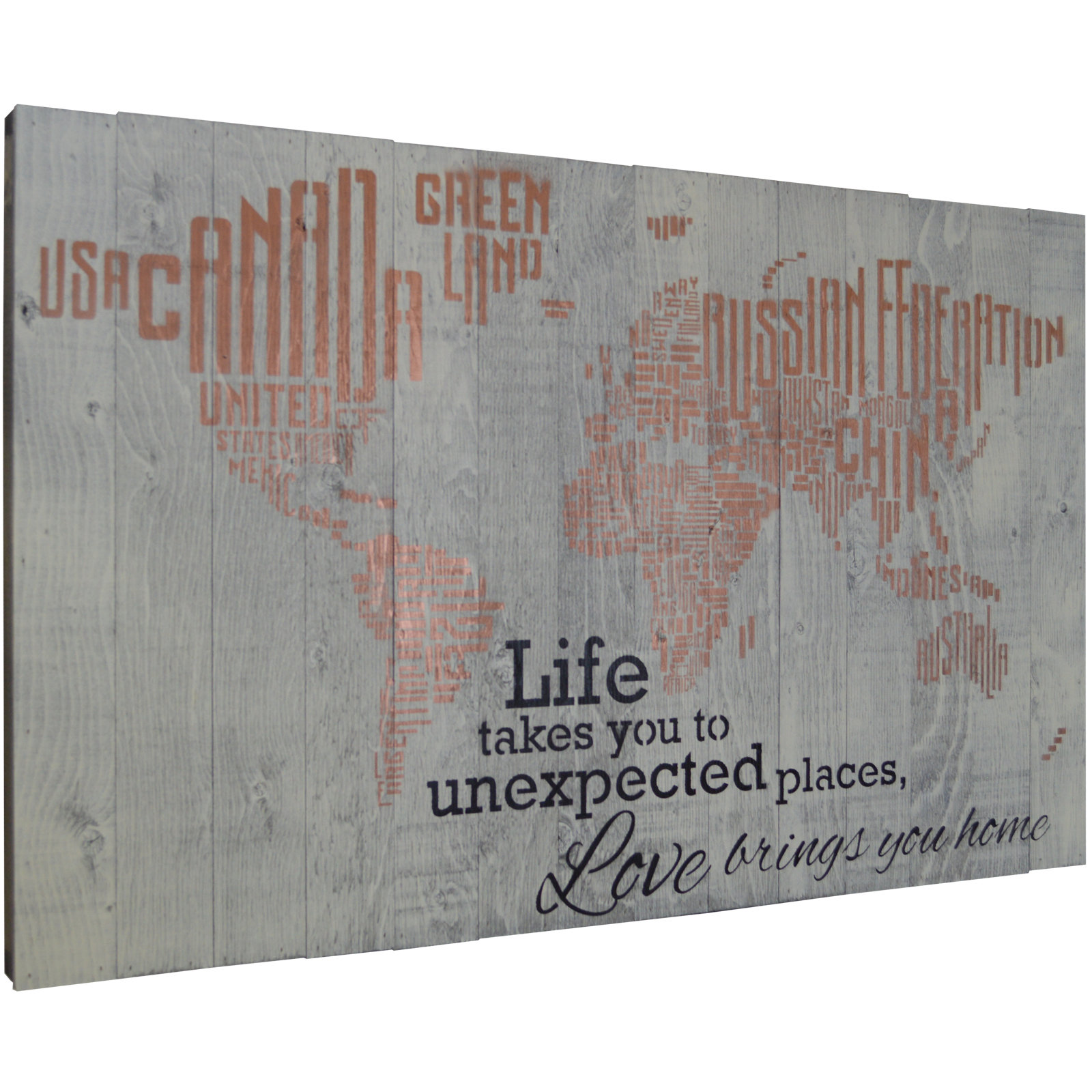 This design features a contemporary world map graphic in distressed bronze with an inspiring quote: “Life takes you to unexpected places, love brings you home” on a rustic black barnwood background fo…. Read More.