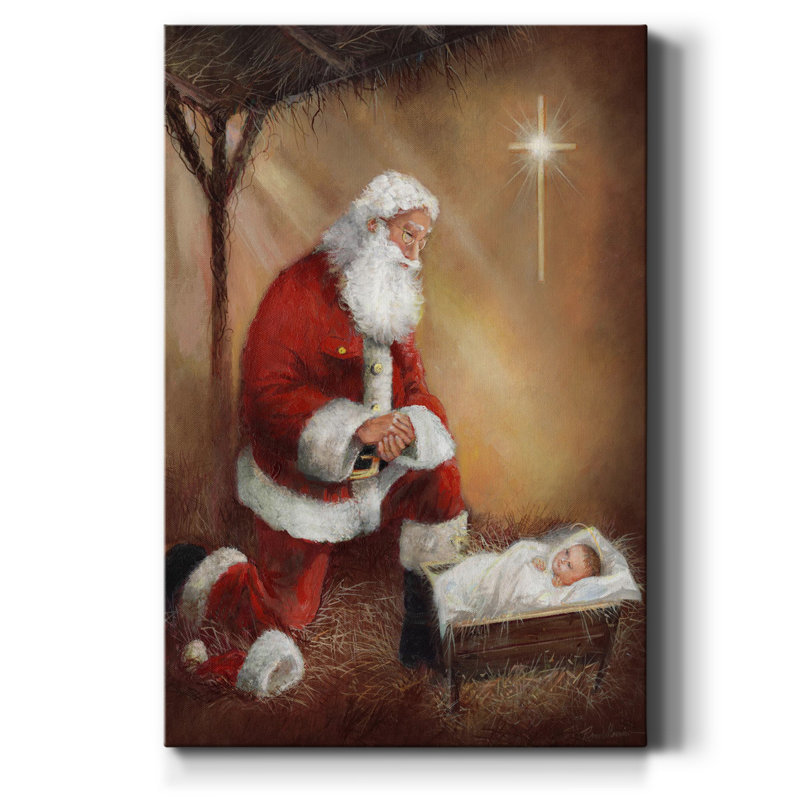 Celebrate the spirit of the holiday season with this religious Christmas painting print featuring Santa visiting baby Jesus in the manger. The portrait-style artwork is printed on canvas and mounted o…. Read More.
