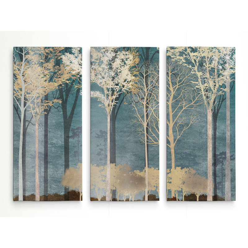 Bring coordinated style and traditional refinement to your living room or bedroom with this 3-piece art set. Titled “Into The Woods,” this set features a triptych of a forest scene with metallic gold and champagne hues over a blue background, creating a depth of composition that we love. It is giclee-printed on wrapped canvas and hand-stretched over solid wood frames for a ready-to-hang look. Made in the USA, this piece arrives ready to install, with included wall mounting hardware.