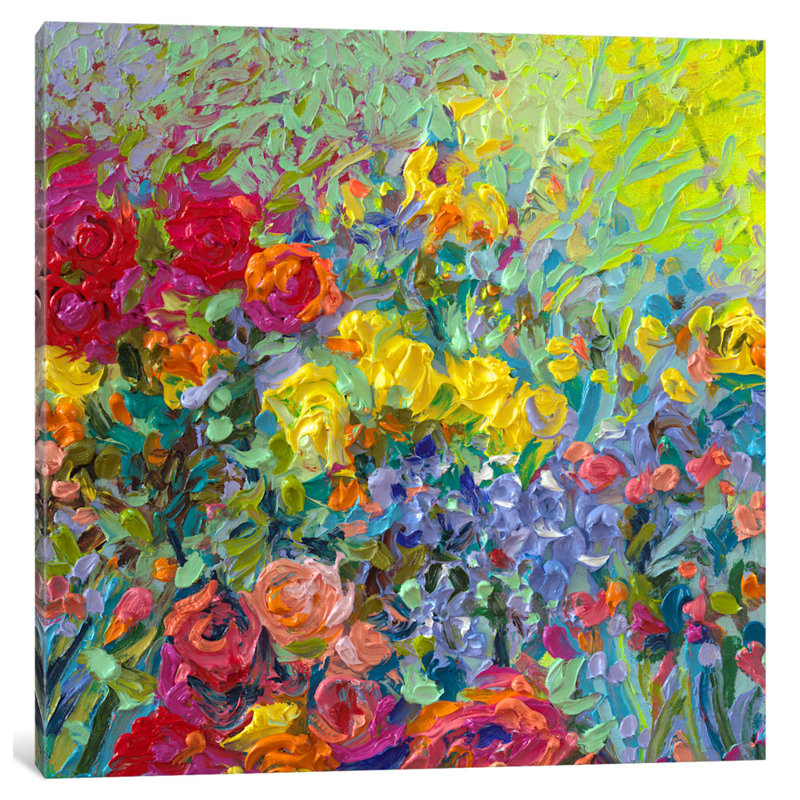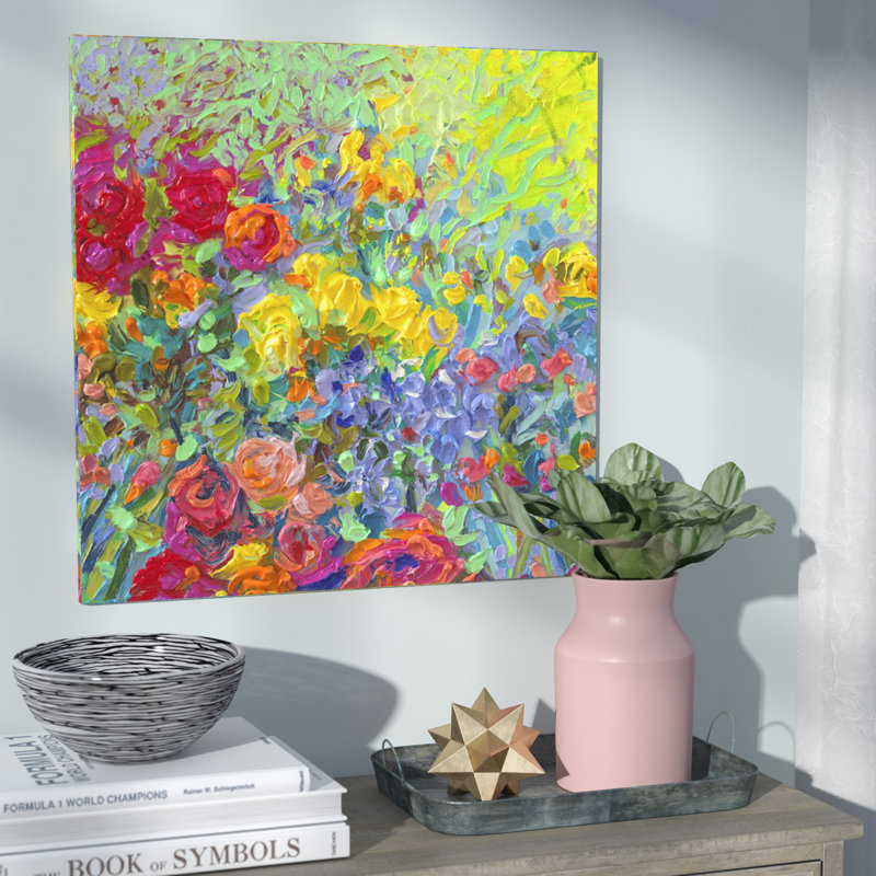 Bright and bursting with botanical beauty, this contemporary painting print showcases an abstract field of flowers in eye-catching yellow, red, lavender, and green hues. Made in the USA, this piece is printed using anti-fade inks on an artist-grade cotton canvas before it’s stretched over pinewood bars. With wall-mounting hardware included for easy hanging, this artful addition is ready to spruce up your space as soon as it reaches your door.