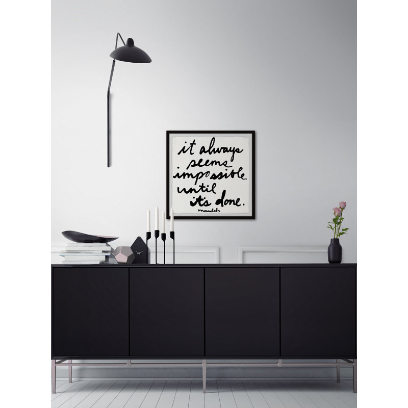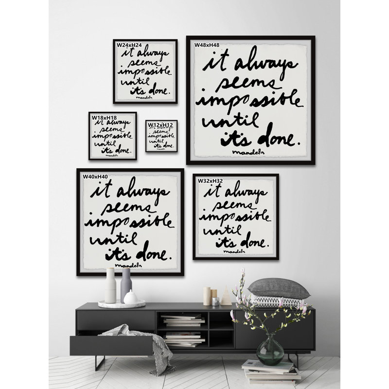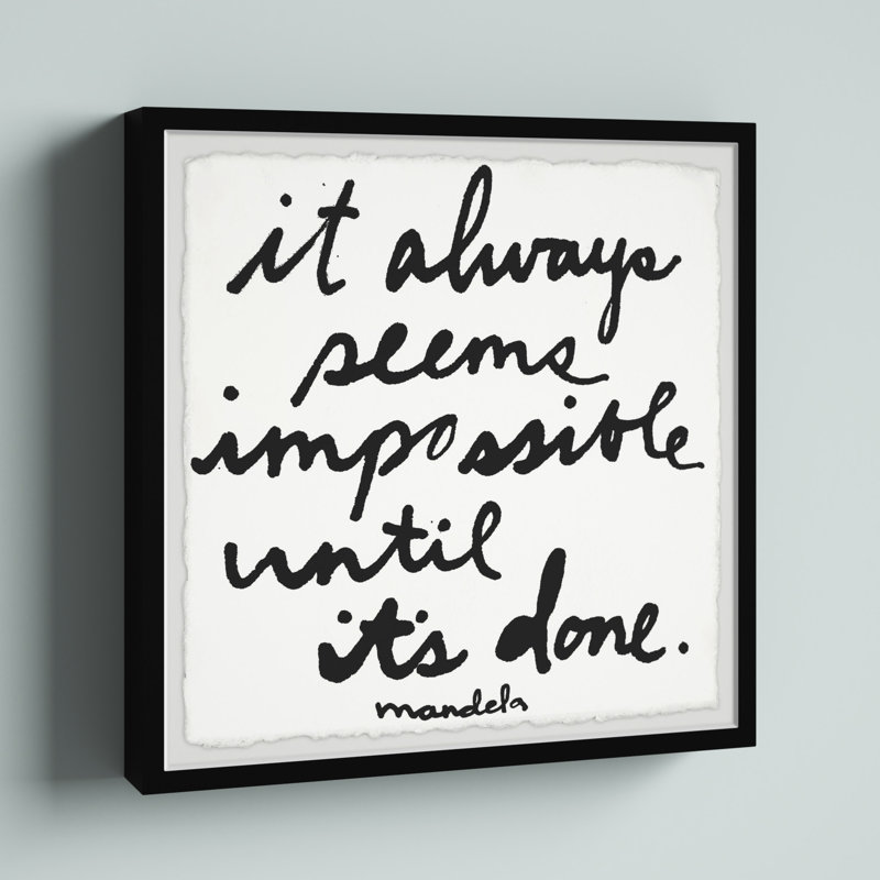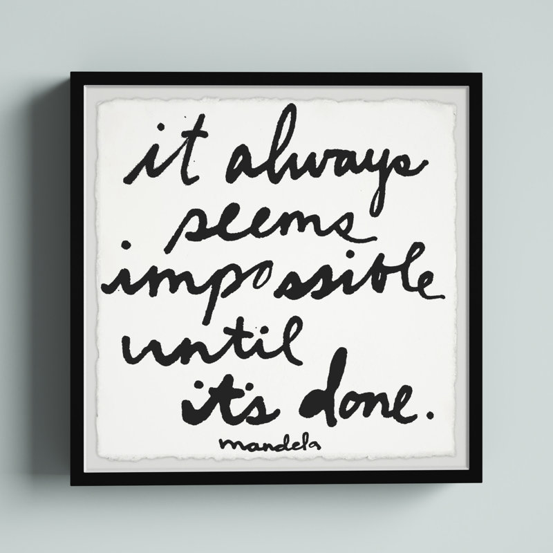 When you need an inspirational quote at eye level, this textual art print is just the piece to adorn your home office or entryway. Designed by Jen Lee and printed in the USA, it showcases a statement by Nelson Mandela that reads “It always seems impossible until it’s done.” This giclee print comes in a handwritten black script using watercolor inks over a white background. It’s printed on paper that showcases deckled edges for a hand-cut look, and it’s set within a traditional black square frame. Two hooks are affixed to the black, so it’s ready to hang right when it arrives.