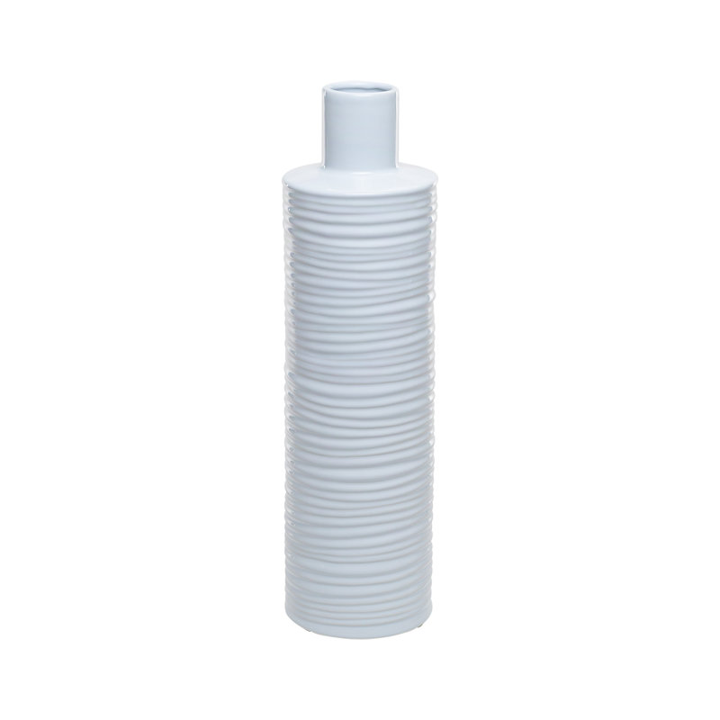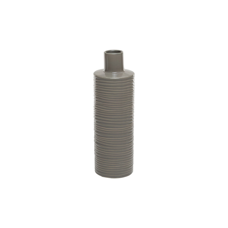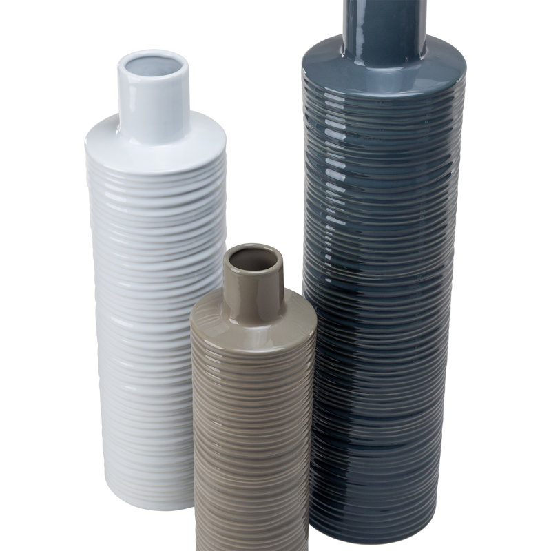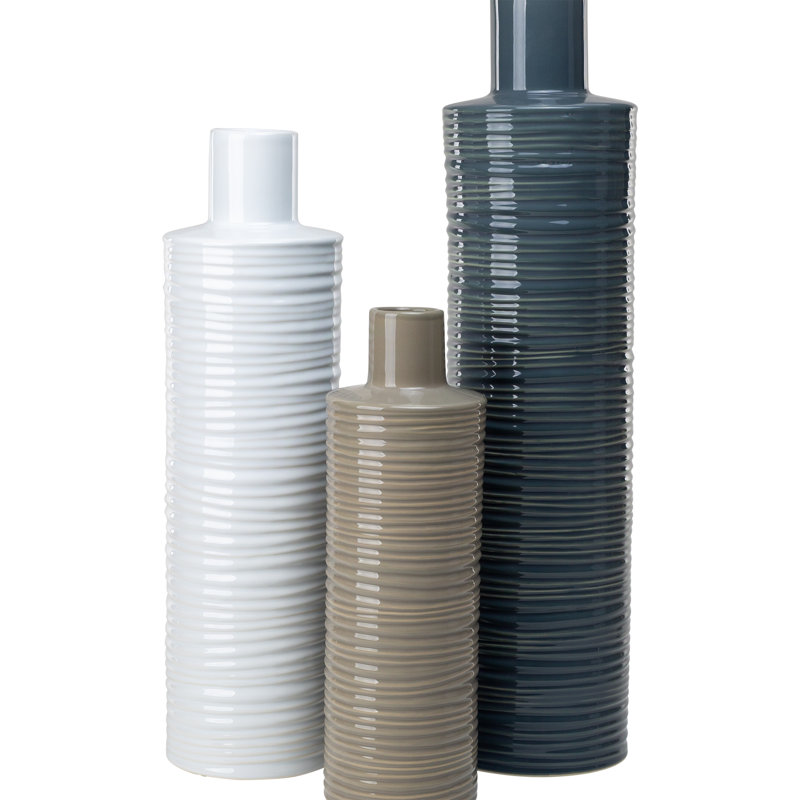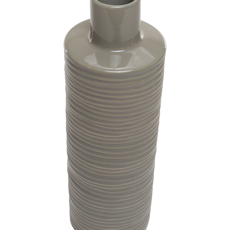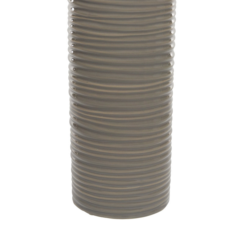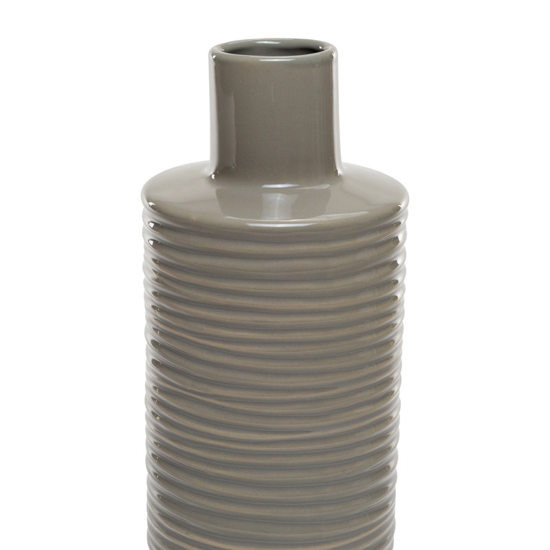 Tasteful as a trio, this set of three vases brings a dash of artful allure to any arrangement in your home. Crafted from ceramic, each piece strikes a slender cylindrical silhouette measuring 20″, 16″, or 12″ tall. Coordinating gray, white, and brown lead-free finishes outfit these designs for earthy and understated appeal, while ribbed details complete the look with a touch of texture. Though these vases are sure to collect compliments on their own, you can also fill them with faux flowers for a bit of botanical flair.