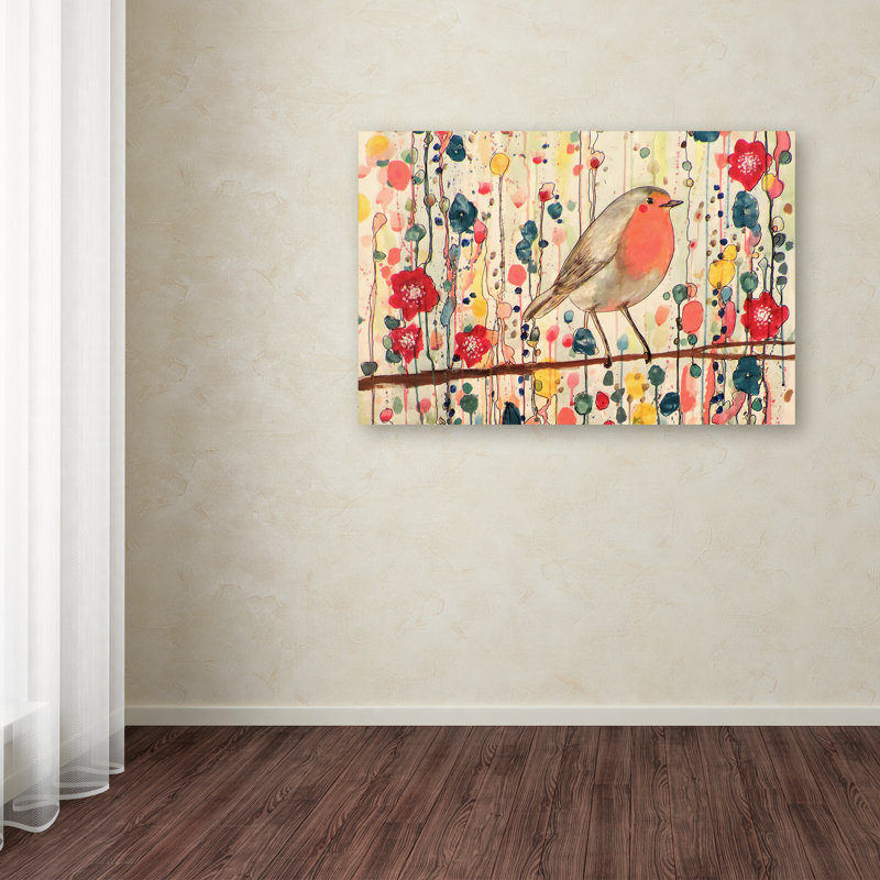 - Ready to hang and gallery wrapped art piece features a bird on a branch surrounded by blue, pink and yellow flowers
