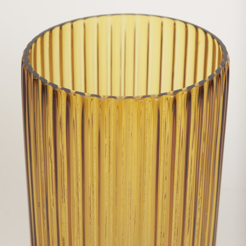 The vase is made of a smokey black or amber delicate ribbed glass that may be used as both a vase for your favorite botanicals and as a candle holder. The delicate ribbed glass creates a fluted textur…. Read More.