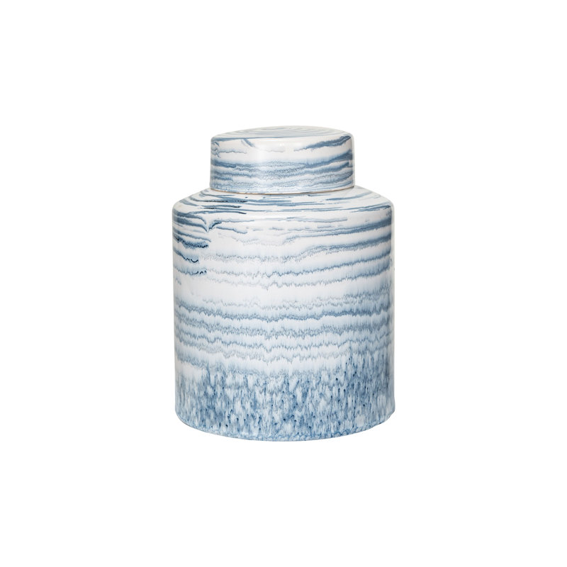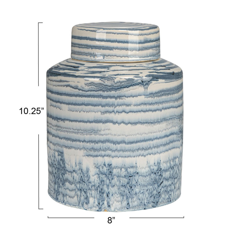 This stoneware striped ginger jar, reactive glaze, blue and white is a stunning piece for any home. It consists of a round base and a domed lid that feature a striped pattern and a reactive glaze in blue and white colors. The reactive glaze creates a unique and eye-catching effect that makes each jar different and special. The lid also has a knob handle that makes it easy to open and close. This ginger jar is perfect for storing and displaying dried flowers, potpourri, or other decorative items in the living room, bedroom, or entryway. It can also be used as a centerpiece or a vase for fresh flowers. This ginger jar is made of stoneware, a high-fired ceramic material that is durable and chip-resistant. It is easy to clean and maintain, and it will last for a long time. It measures Measures 8 inches in diameter and 10.25 inches in height (Each one will vary due to the nature of the glaze), making it suitable for any space. This stoneware striped ginger jar, reactive glaze, blue and white is a must-have for anyone who loves style and elegance.
