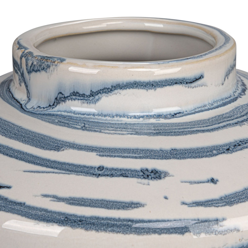 - A beautiful and classic ginger jar that features a striped pattern and a reactive glaze in blue and white colors