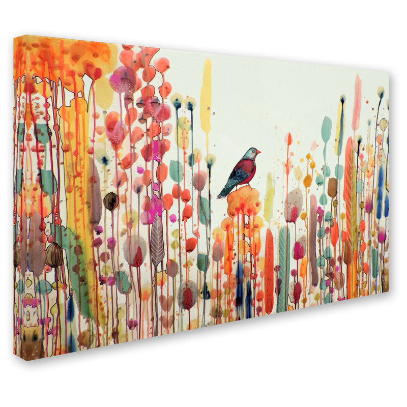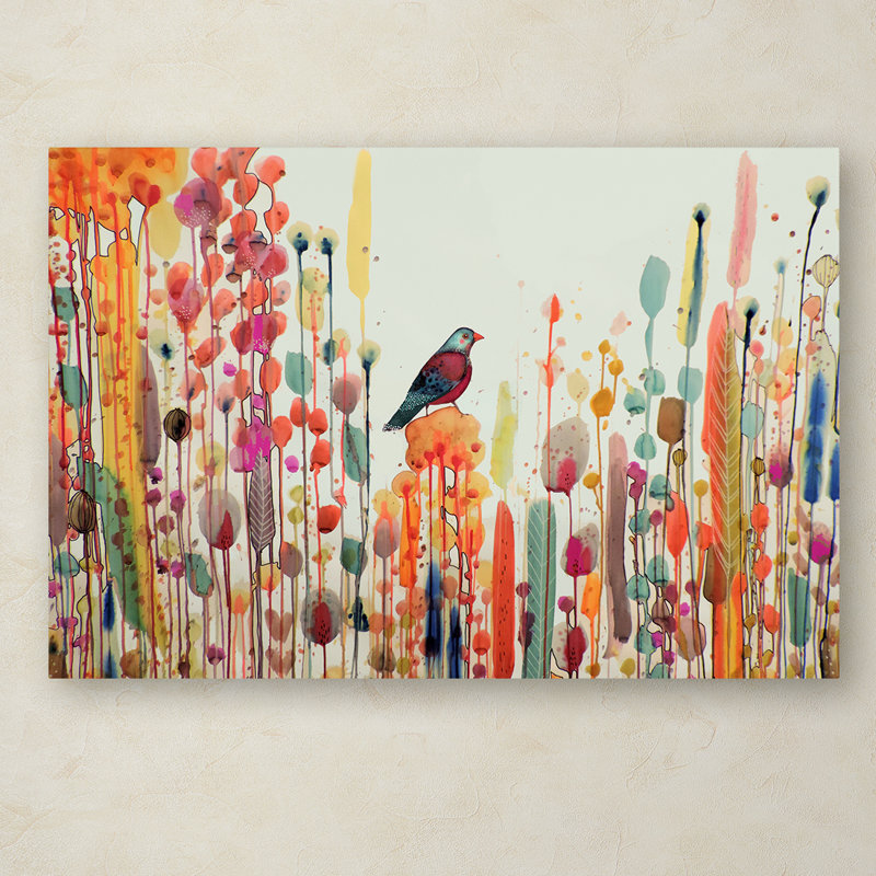 • Ready to hang and gallery wrapped art piece features a small bird amidst orange and pink watercolor drips