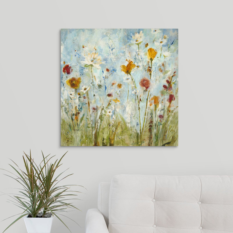 Inspired by a warm spring afternoon, this impressionist landscape painting on canvas showcases dainty flowers in a grassy field using distinct brushstrokes and pleasant hues. Made in the USA, this artful image is printed using Fade-resistant archival inks on polyester blend canvas, then hand-stretched and gallery-wrapped over a warp-resistant stretcher bar frame. Available in a selection of sizes to best suit your space, this piece comes ready to hang right out of the box with sawtooth hardware included.