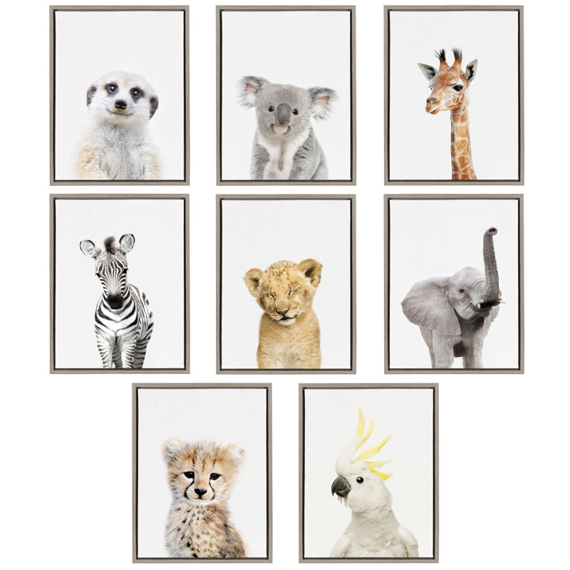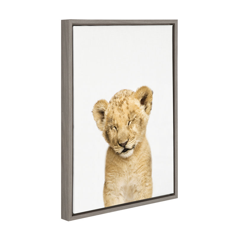 This sweet young lion cub is caught napping in this adorable digital art print. Printed and framed in the USA in Waunakee, Wisconsin, this framed floating canvas art will be a pleasure to look at every day in your living room, bedroom, nursery, or any room in the home. Printed on gallery-wrapped canvas and framed with a gray-washed, wood grain look, and lightweight polystyrene frame, this colorful wall art has two hangers already attached to the natural wood-colored MDF back for easy wall display.