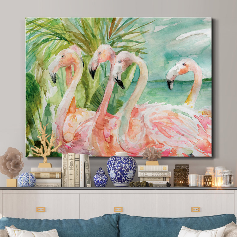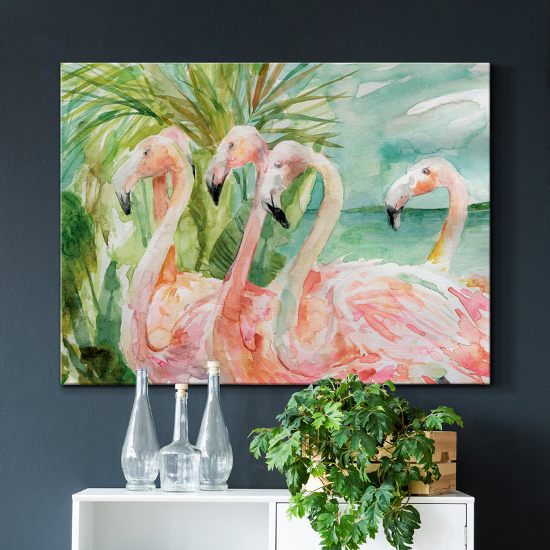 This painting print brings a tropical feel and bold colors to your coastal-themed space. It’s printed with premium inks on wrapped canvas for a gallery-worthy look. The design features five elegant flamingos in stunning hues of pink and peach against bright green ferns and a turquoise sea. We love that this wall art comes with mounting hardware, so it’s ready to hang right out of the box. Arrange it in your bedroom, living room, or home office.