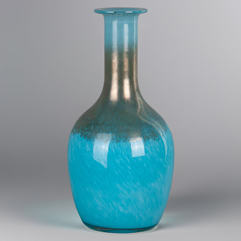 A stunning cerulean blue glass vase, metallic bronze hues accent, handcrafted and mouth blown. A lovely rounded body with long staight goose neck and top smooth flat lip edges. Just perfect for any ro…. Read More.