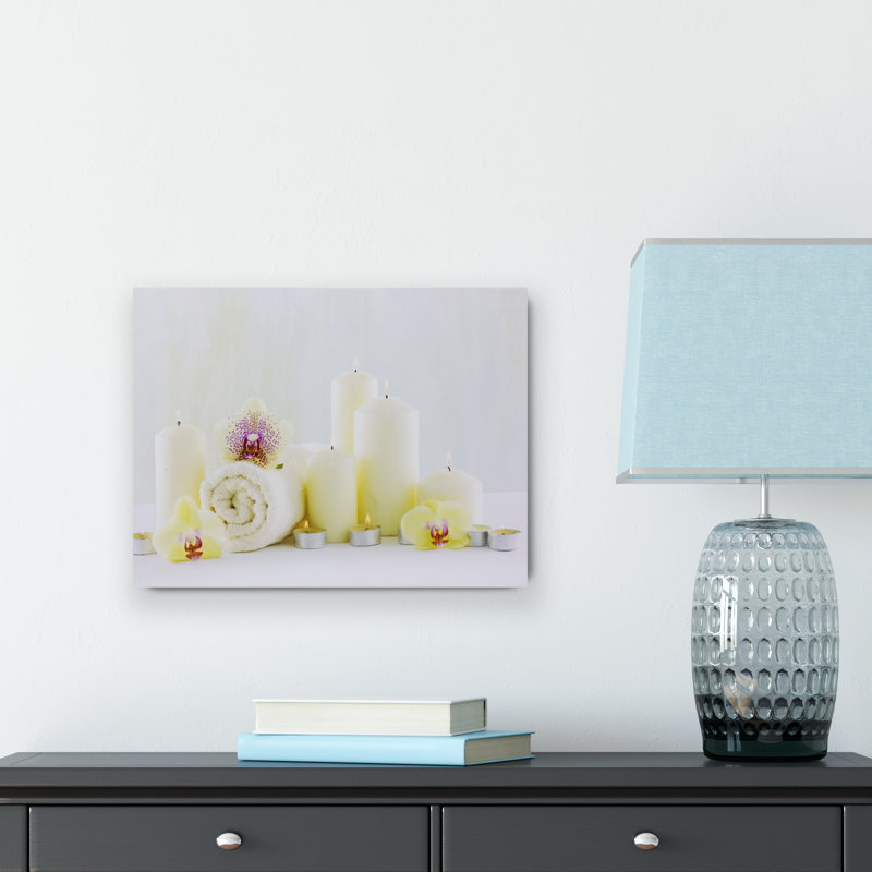 Depicts beautiful orchids with candles burning and a towel ready for a nice relaxing spa day. Candles are illuminated from behind the canvas by 7 LED lights. Comes ready-to-hang with a hook on the bac…. Read More.