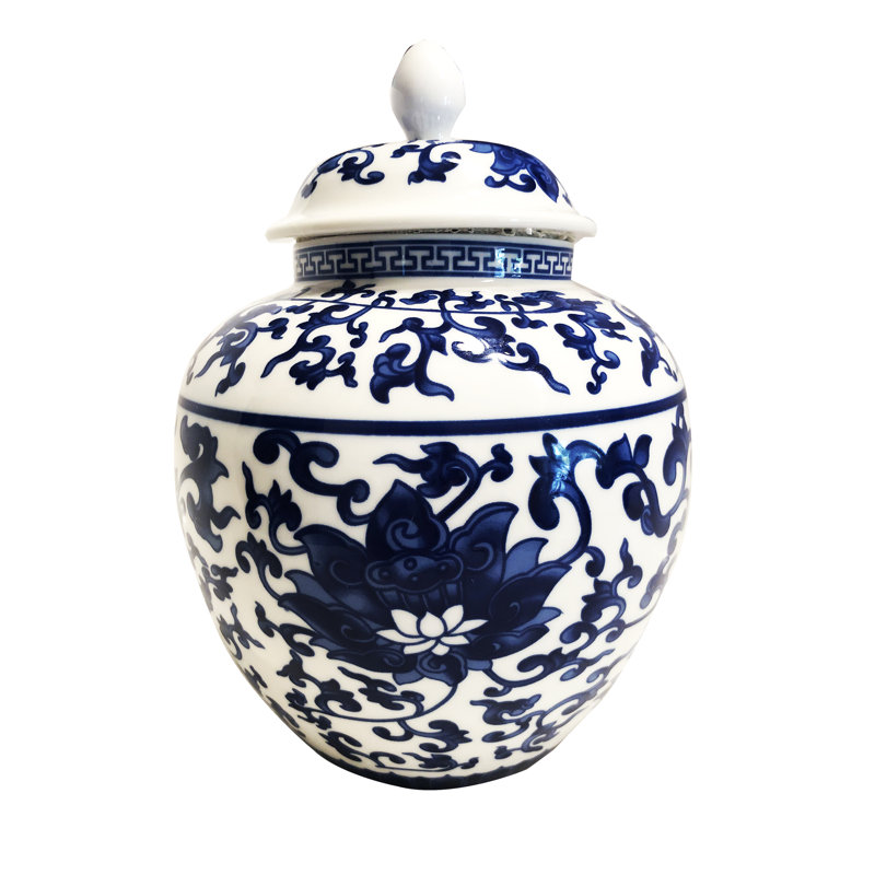 New Loesing Large Lotus Temple Display Jar. Finished in a classic Asian finish white porcelain background with delicate blue flowers. Our jar makes a fine addition to one’s table, counter, or desk.