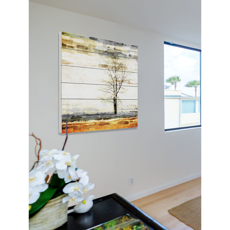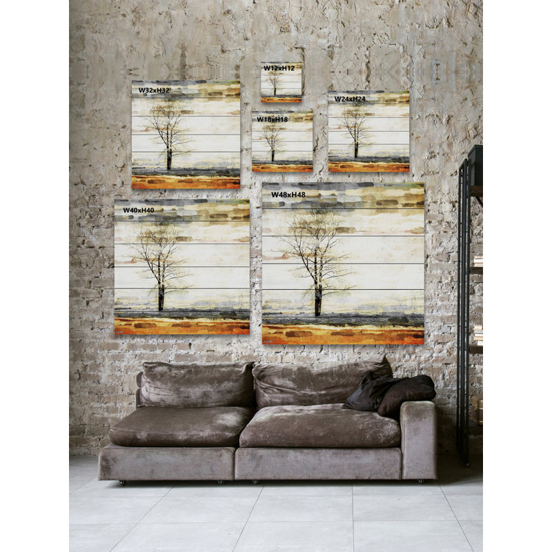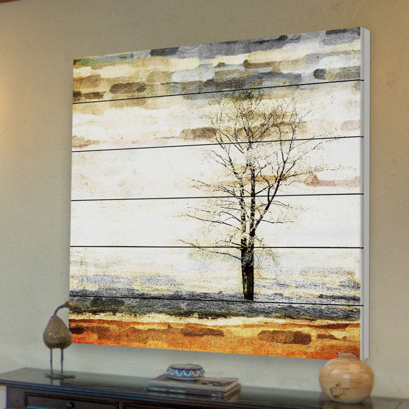 Welcome natural inspiration and a touch of tranquility into any arrangement with this peaceful painting print, showcasing a single tree in neutral gray and brown hues for understated appeal. Proudly made in the USA, this piece is printed on pinewood with a plank-like background and visible knots for a dash of rustic character. Wall-mounting hardware is included, so this artful accent is ready to hang up as soon as it reaches your door.