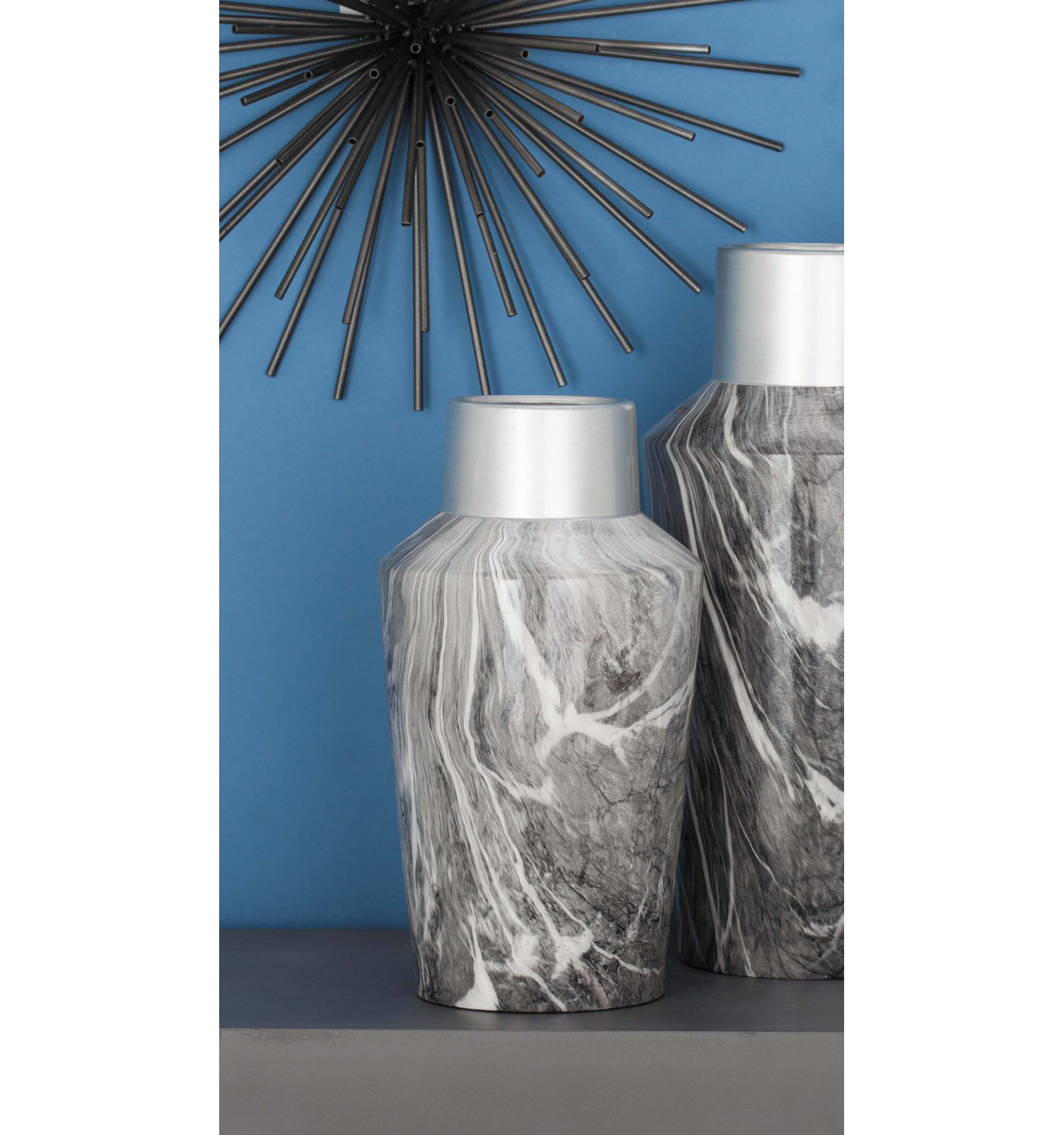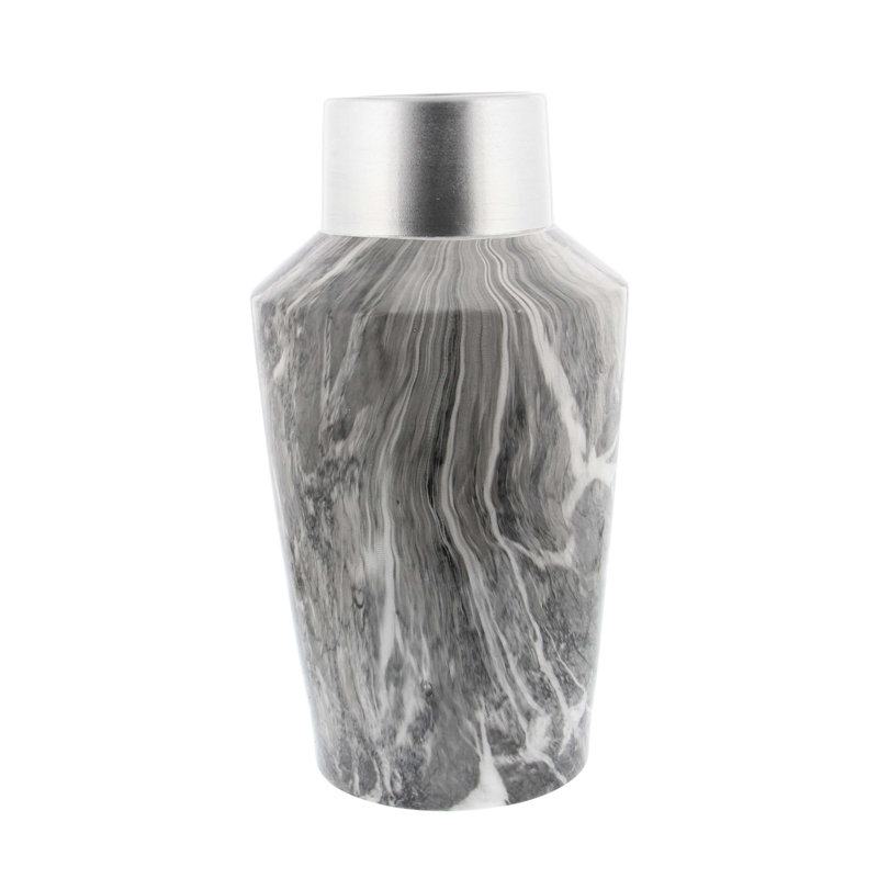 - A round urn-shaped vase designed with a marble-glazed body & a metallic-finished round cylindrical neck.