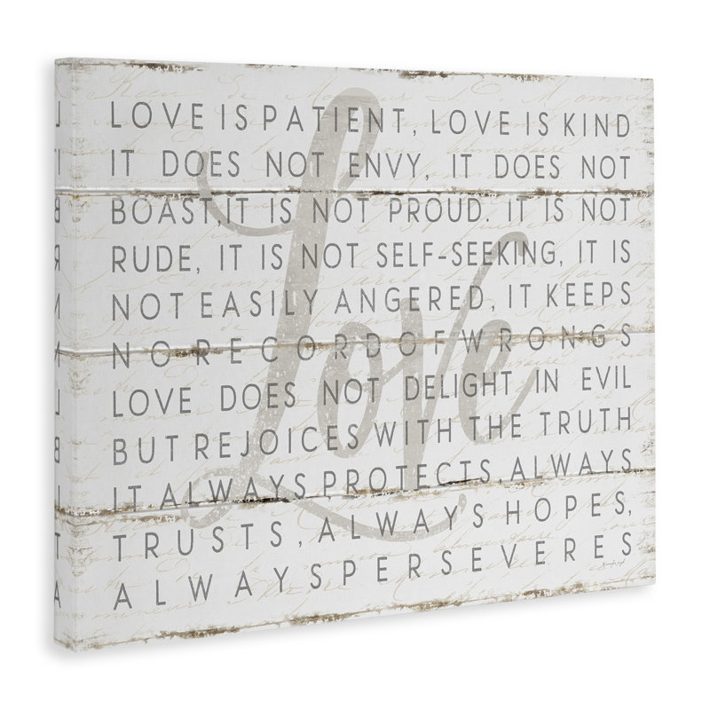 No other writing has defined love for more people than 1 Corinthians 13:4-7. Display this passage proudly on your wall in farmhouse-chic style with this graphic art print! Designed by Jennifer Pugh, this artful image is giclee printed on a premium canvas using high-quality inks for a gallery-worthy display. Made in the USA, this piece arrives ready to hang right out of the box with wall-mounting hardware included for effortless installation.