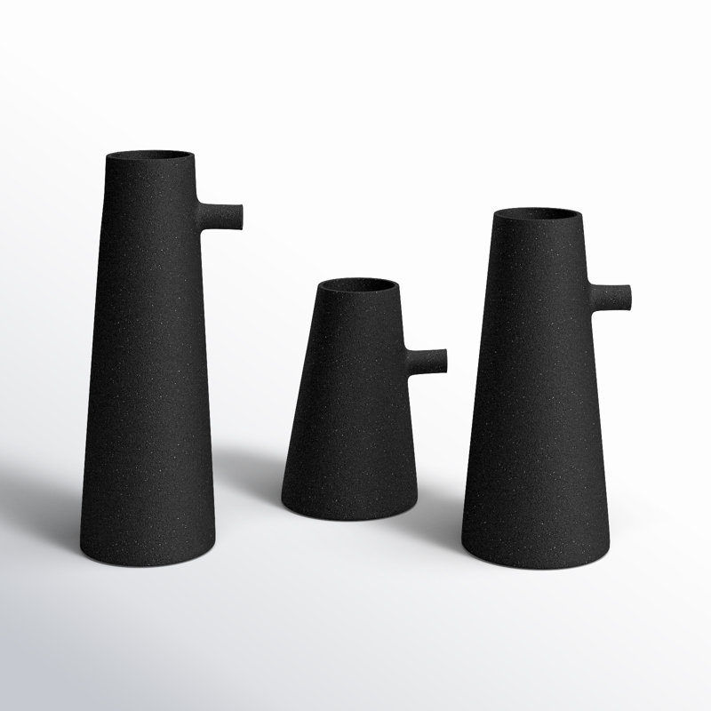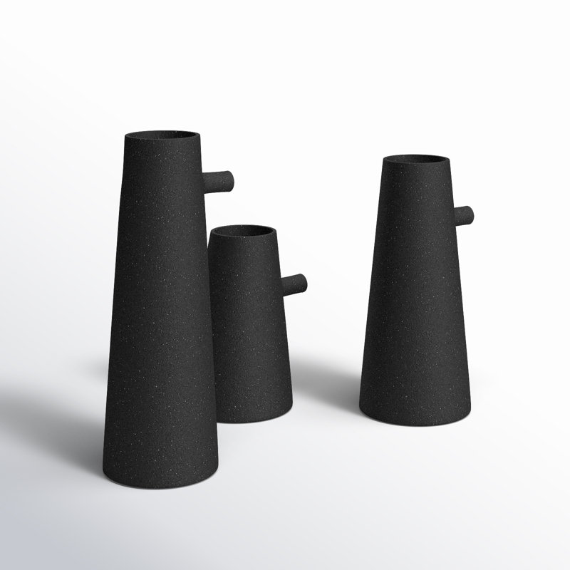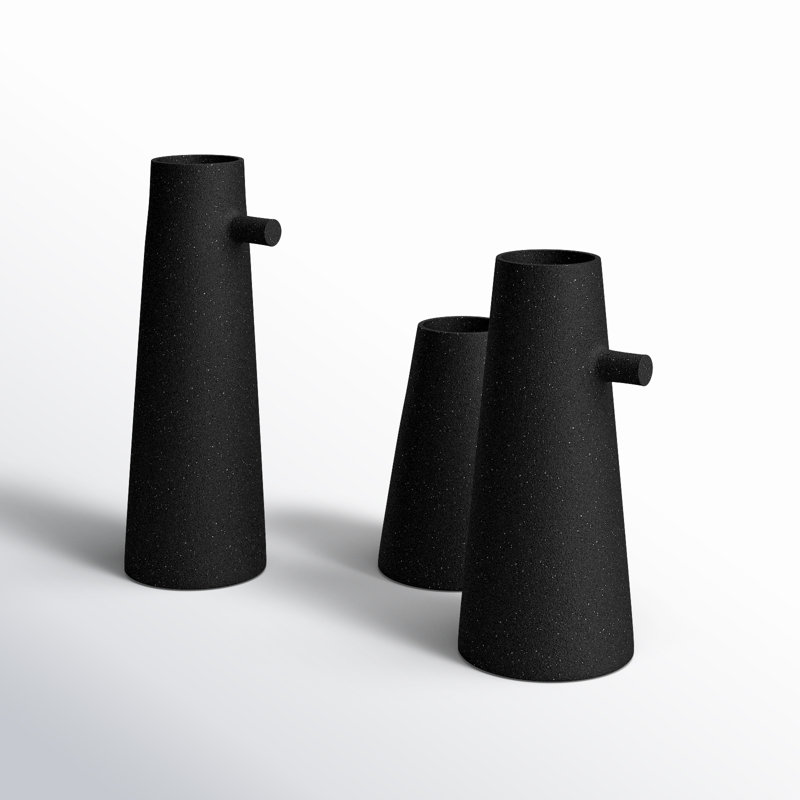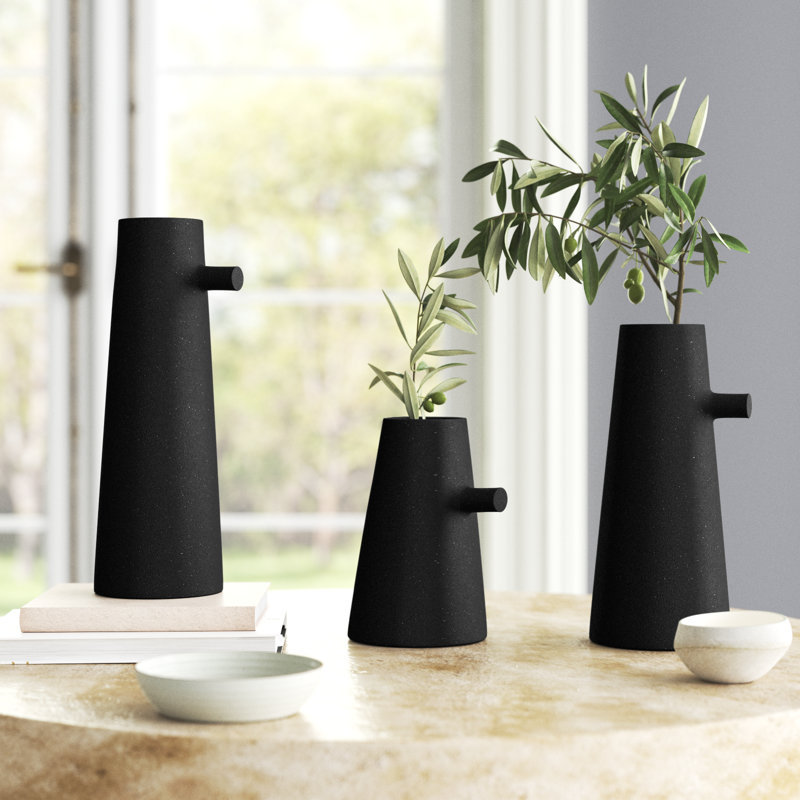 Combining organic inspiration with modern design, this set of three vases brings a designer quality to the home. Made of powder-coated iron with a texture matte black finish, the pieces feel timeless and chic. While the vases are similar in width, each one has a different height.