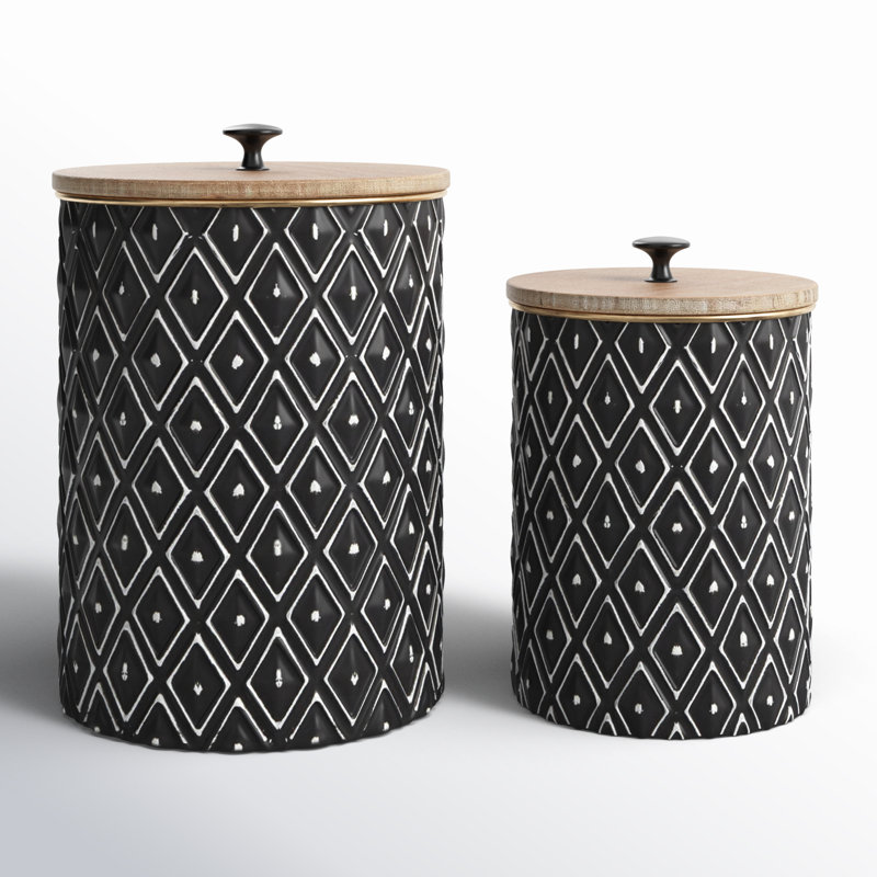 This 2-piece set of decorative jars turns storage into style with their elegant patterns. Each jar is crafted from metal with an ebony black finish and a soft sheen, while the lids feature carved wood with a sculpted knob handle for easy grip. The embossed white diamond motifs and gold-trimmed rims elevate the design, making them a stylish addition to your space. Measuring about 11” and 9” tall, these jars can function as decorative accents or storage containers for small trinkets. Please note that these jars are for decorative purposes only and are not food safe.