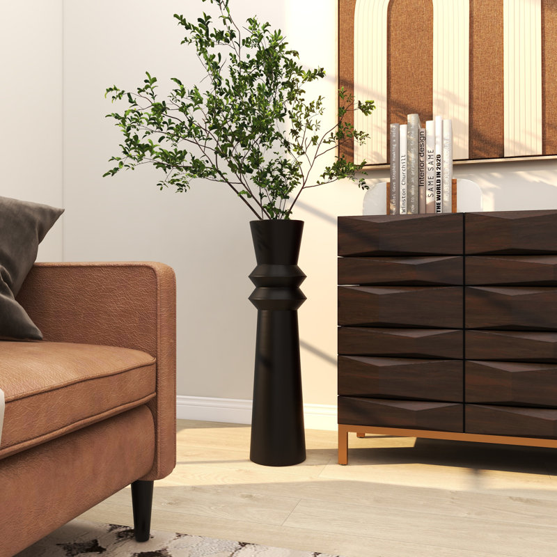 - The tall metal vase highlights a solid matte black or cream finish for a minimalist modern appeal