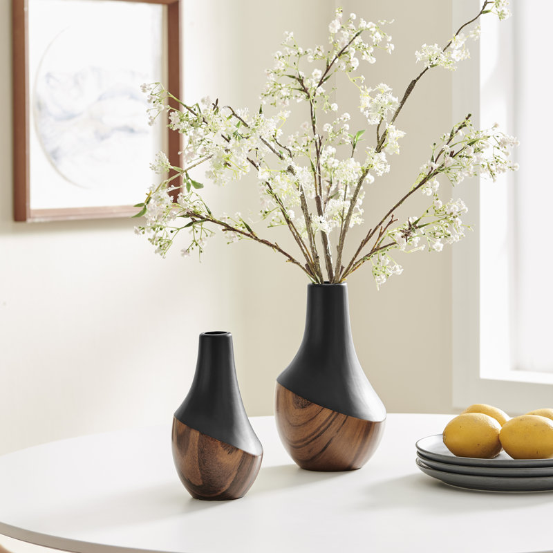 - Both vases feature contrasting design with matte black and wood texture finish