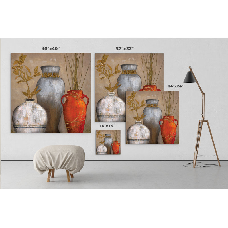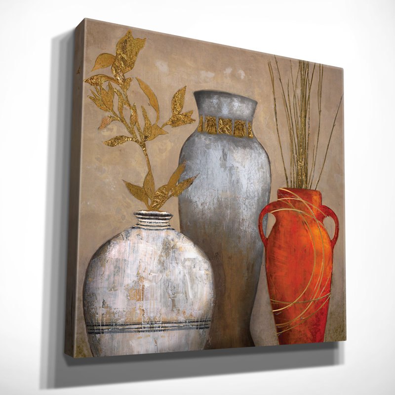 Bring classic style with an eclectic touch to your walls with this art print. Elevating your space with touches of metallic gold, this piece shows off a still-life composition of three distinct vases, each detailed with geometric accents and red, beige, and brown hues. With grass and floral details, this reproduction is printed with vivid Giclee inks on artist-quality canvas, which is stretched over a wood frame for a gallery-worthy look. Bonus: It arrives with a wall hook for easy installation in your home. Available in several sizes to choose from.