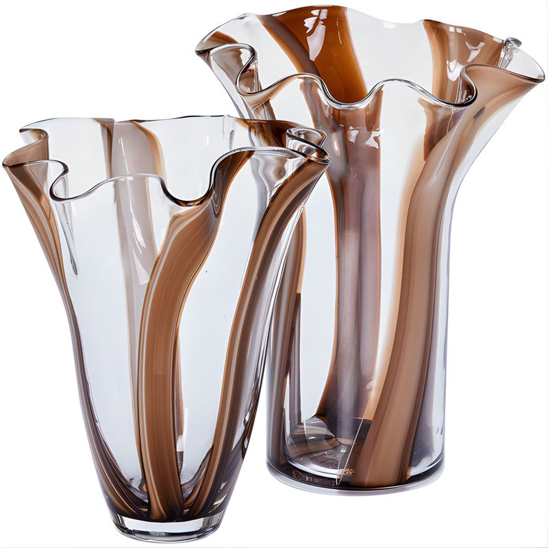 Mia Handblown Ruffled Glass Vase Set–Striped Artistry with Ruffled Rims (Set of 2)