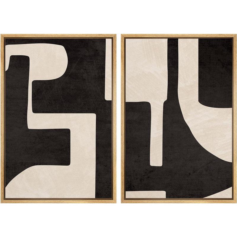 Mid Century Shape Black & Cream Geometric Paint Stroke Abstract Neutral Décor Framed Canvas 2 Pieces Print Wall Art