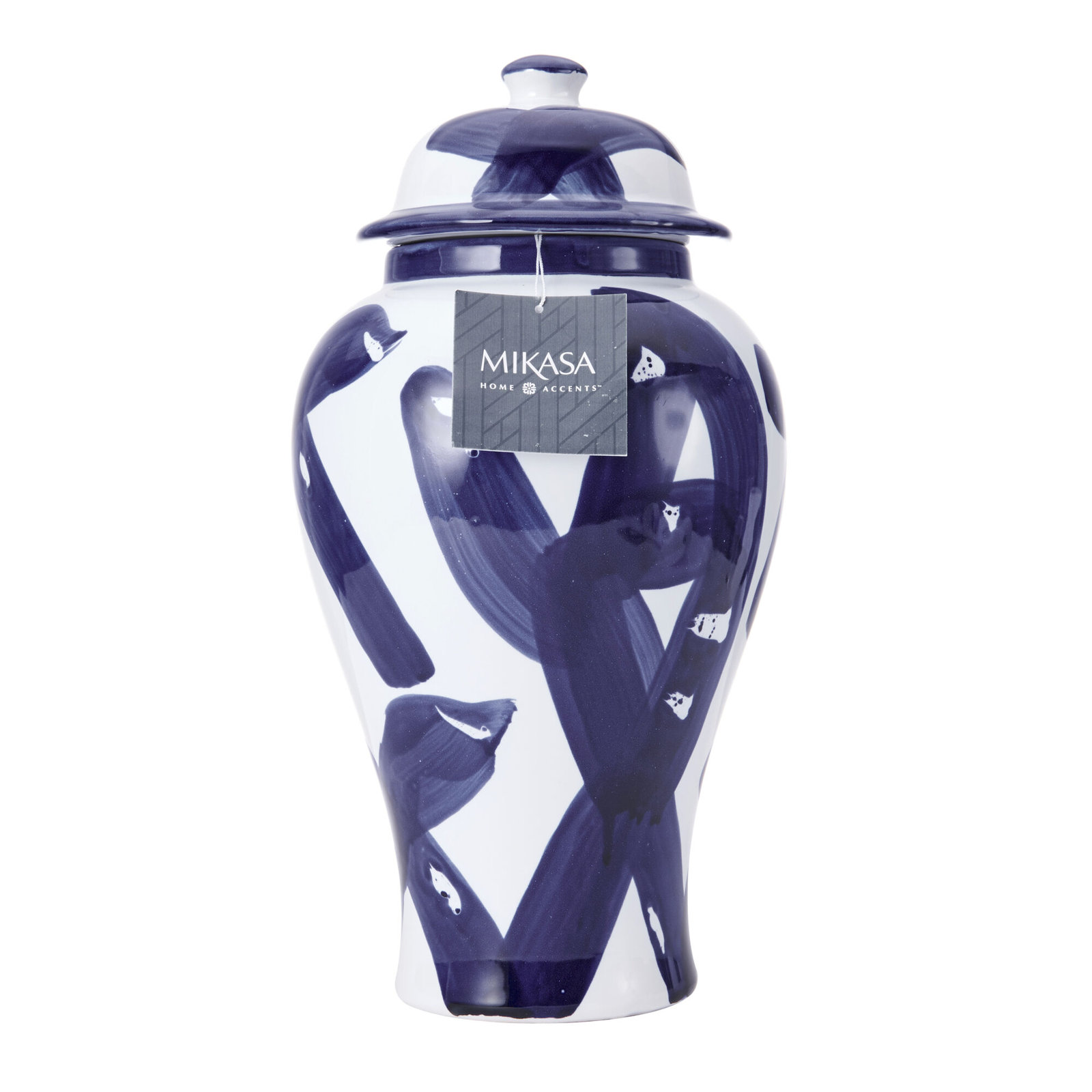 This Blue and White Paint Stroke Canister by Mikasa features a unique pattern that brings a bold look to your decor. Use this functional decor piece to store small household items or showcase faux flo…. Read More.