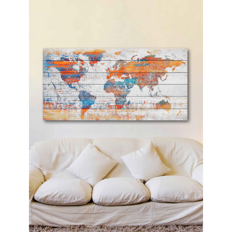 Take a wide-open wall from vacant to vintage with this rectangular painting print. Awash with antique inspiration, it showcases a map of the world with stippling details and a plank-like background fo…. Read More.