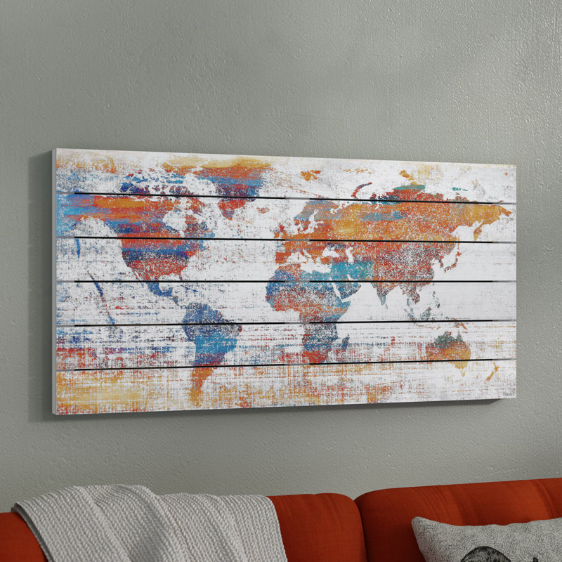 Take a wide-open wall from vacant to vintage with this rectangular painting print. Awash with antique inspiration, it showcases a map of the world with stippling details and a plank-like background for a rustic and aged look. Though its design is distinctive, this artful accent is outfitted in neutral gray and black tones that blend easily with a variety of color palettes and aesthetics. Proudly made in the USA, this piece is printed on white pinewood with pre-installed hooks on the back, so it’s ready to hang right away.