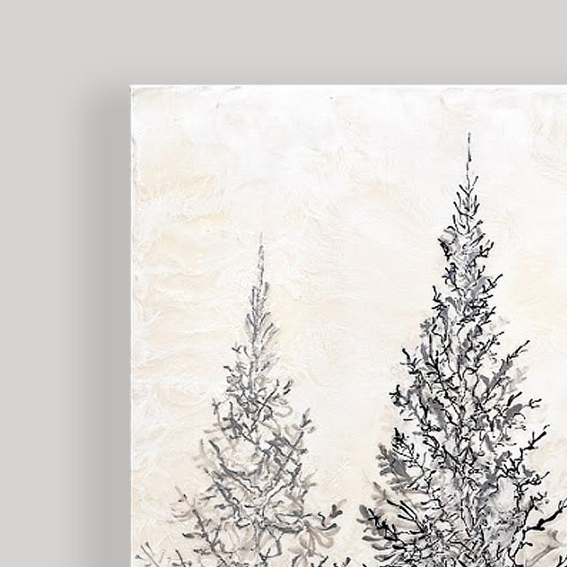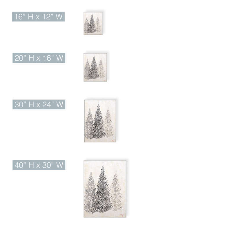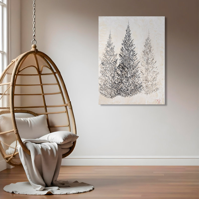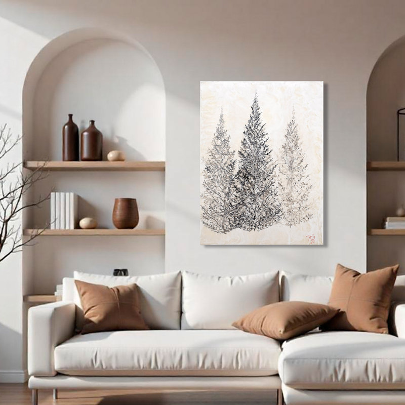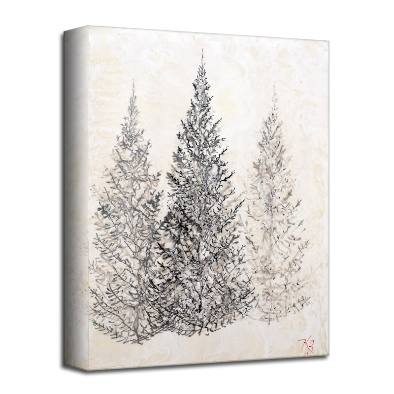 Bring a touch of wilderness to your interior with this canvas print. Featuring a modern take on nature, it showcases geometric ink-like brush strokes detailing a trio of evergreen trees among a misty …. Read More.