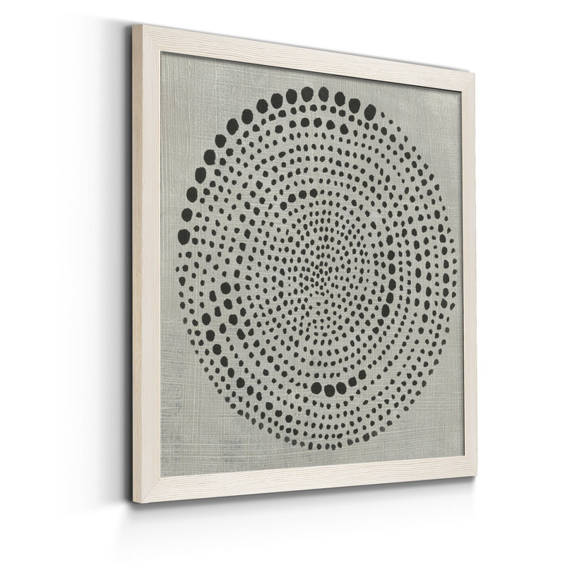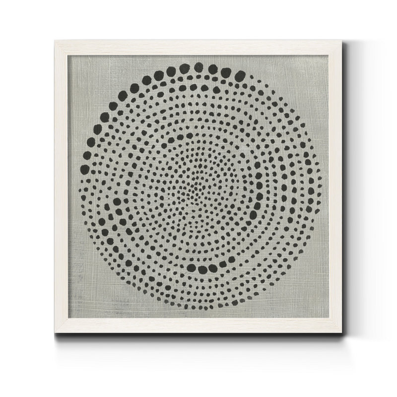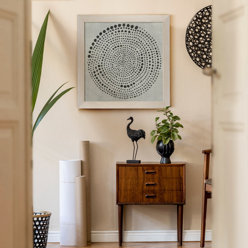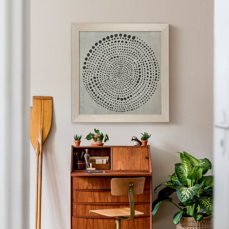 This art print fills out your gallery wall with playful shapes and a boho aesthetic. Originally a painted piece, it’s printed with premium inks on wrapped canvas for a museum-quality look. The square design, “Mythos II,” features a layered circle – that reminds us of a tree ring – done in fun black brush dots of various sizes against a white background. We love that this wall art comes framed and with mounting hardware, so it’s ready to hang right out of the box.
