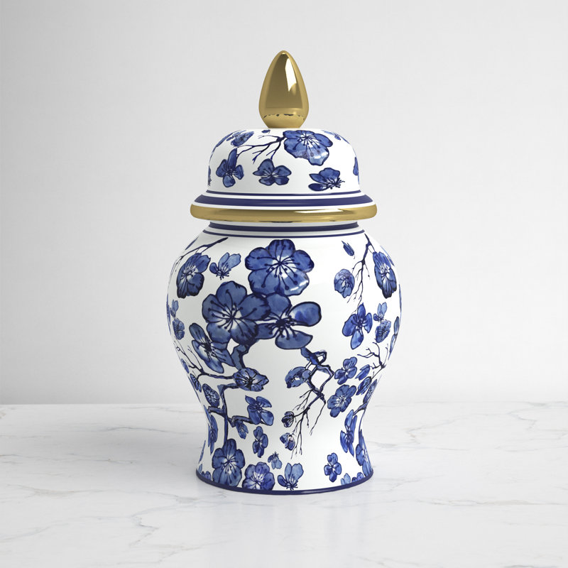 Nina 14″ Ceramic Temple Jar with Lid Contemporary Vintage Style Blue and White Chinoiserie Floral Design