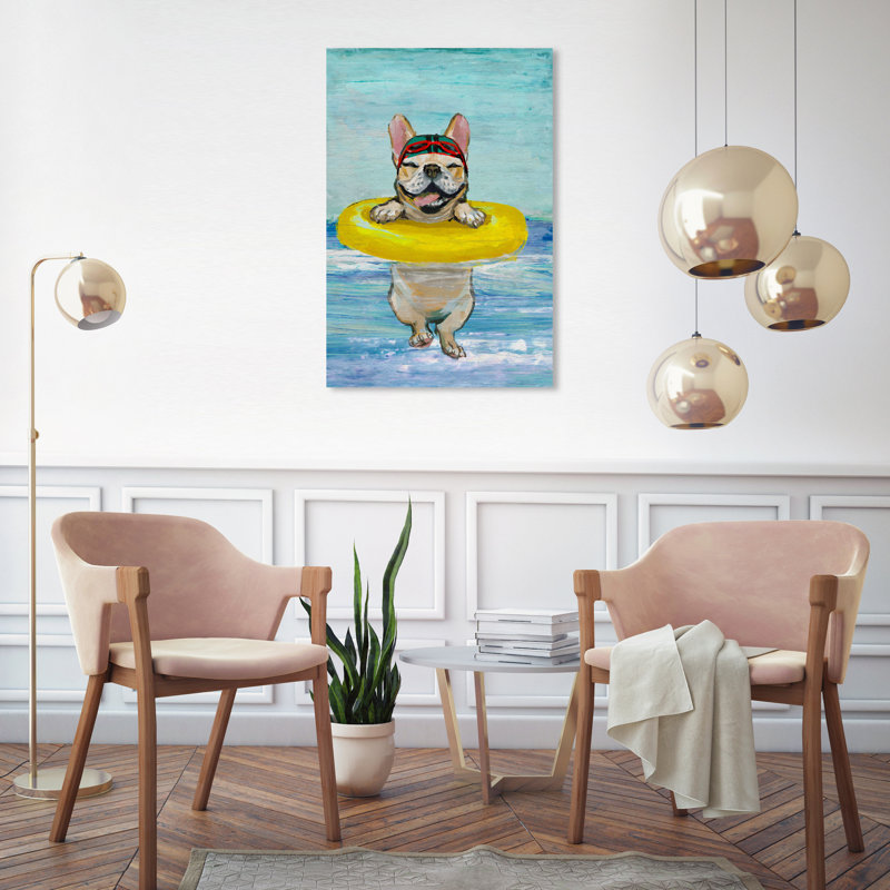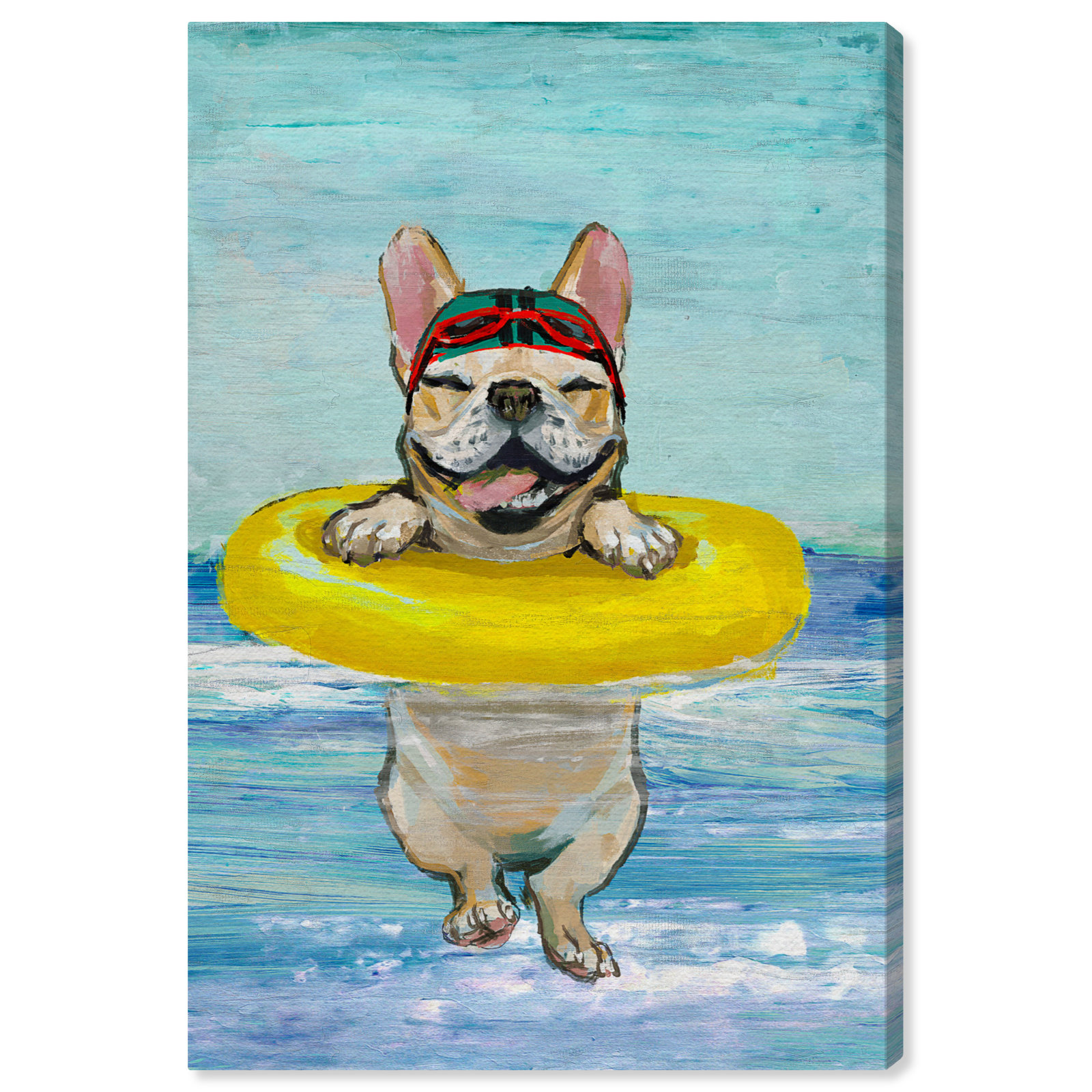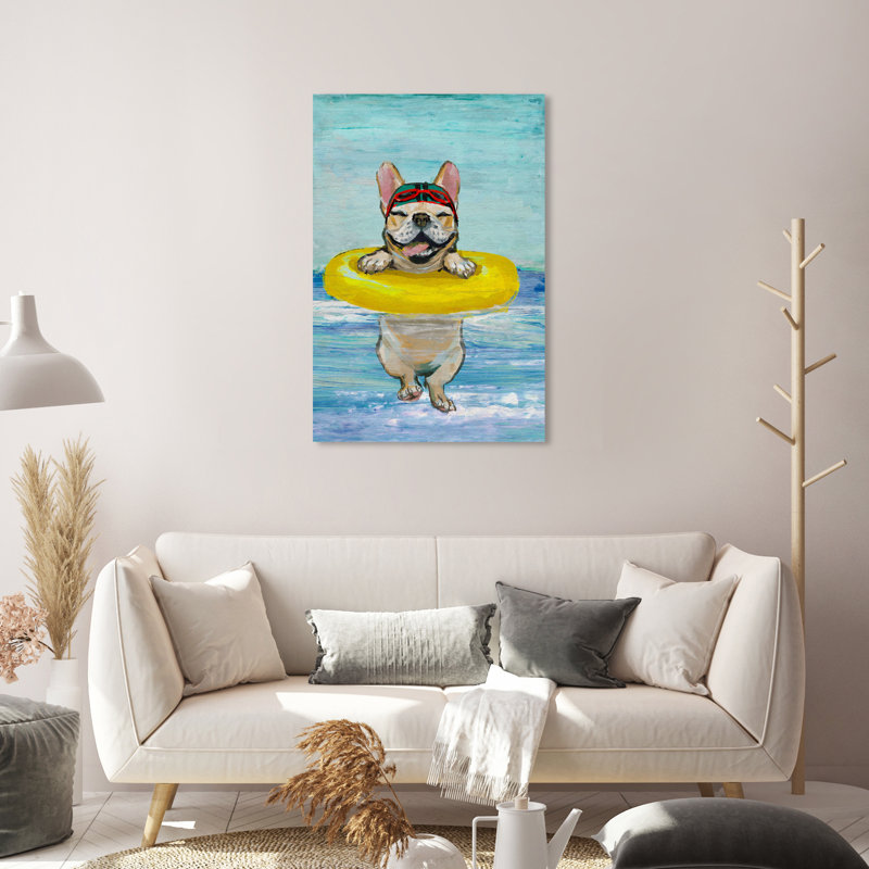 Titled Nolea Sea Dog by artist Oliver Gal, this graphic art features a smiling French bulldog wearing goggles and a swimming cap supported by a yellow inner tube. This giclee print is an original edition and displays like fine art, made with a worldwide standard for museum-quality printing using ultra-premium and fade-resistant inks to guarantee high definition and vivid colors. Choose between the wrapped canvas for a frameless and modern look, or the decorative floater frame of your choice: onyx black, pearl white, and lux gold. Printed on gallery-wrapped canvas and framed in a wooden frame, this timeless wall art is ready to hang with a nail and hook included.