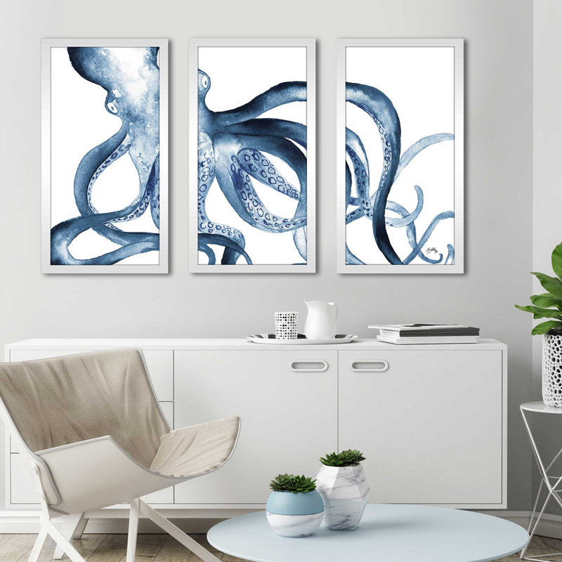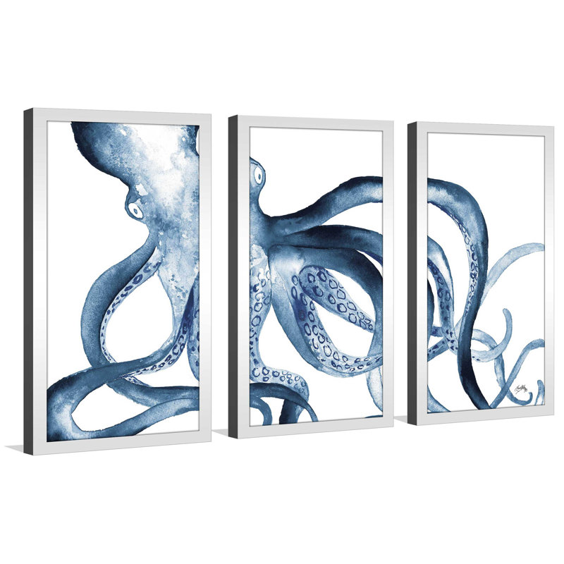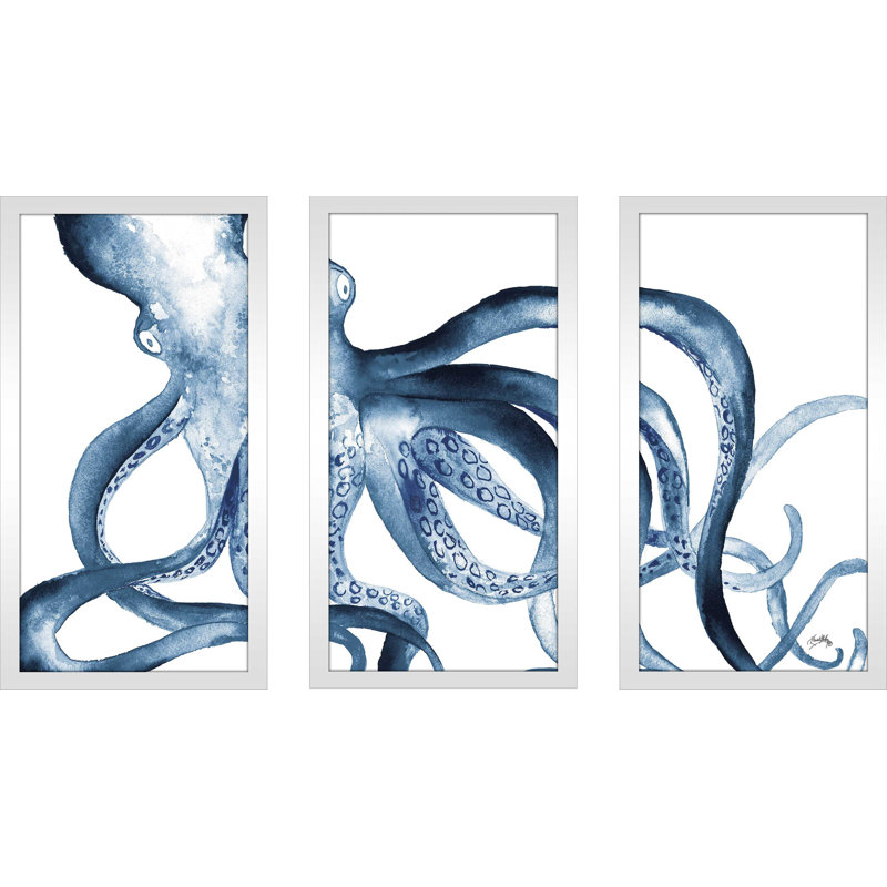 “Octopus in the Blues” by Elizabeth Medley is a striking triptych that captures the graceful movement and captivating form of an octopus in beautiful indigo and navy hues. Set against a crisp white background, the sweeping tentacles and watercolor texture create a dynamic coastal statement piece perfect for modern, beachy, or nautical interiors. This contemporary wall art brings the mystery and elegance of the ocean to life and adds a splash of marine charm to any room.
