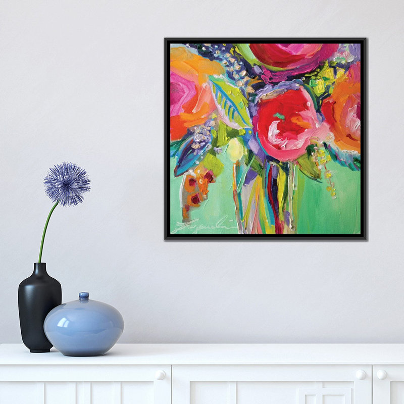 Showcasing an up-close depiction of bright blooms in a bouquet, this contemporary print serves as a floral focal point in any room in your home. Its vibrant pink, green, purple, and orange tones instantly energize and brighten your existing arrangement, while its lovely image adds artful appeal to your space. Made in the United States, this wrapped canvas includes hanging accessories so it’s easy to mount this design on an open wall.