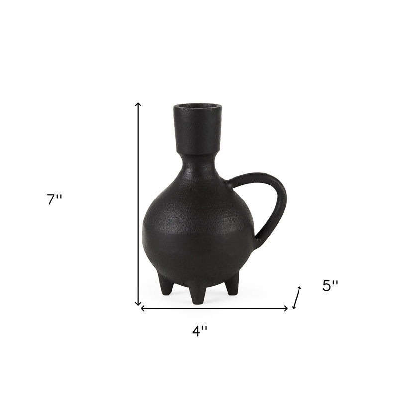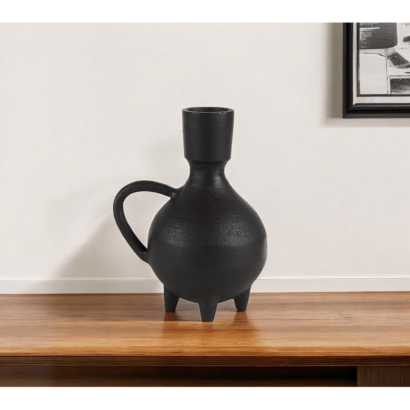 - Features a unique round shape with legs, a tall neck, and a handle.