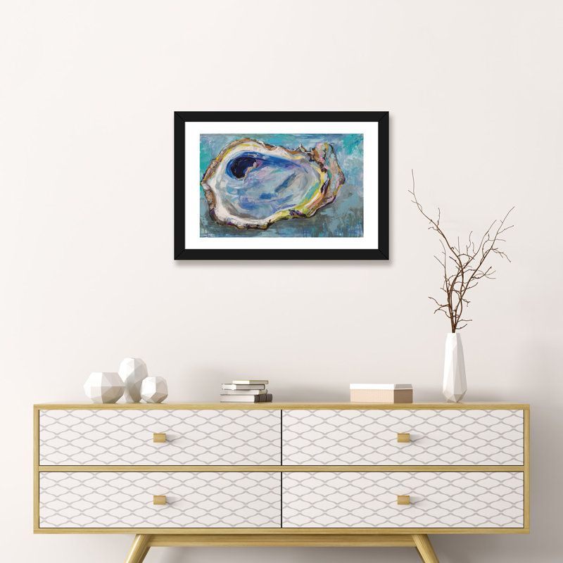 A tasty still life. This giclee print is an eye-catching close-up of a shucked oyster, ideal for lovers of the coast and of speciality seafood. Reproduced from an original work by Jeanette Vertentes, it features vibrant brushstrokes in blue, yellow, and gray tones to create this mouthwatering treat from the ocean. This oil painting is printed on a rectangular surface in a variety of sizes. Plus, two hooks are affixed to the back for hassle-free hanging right out of the box.