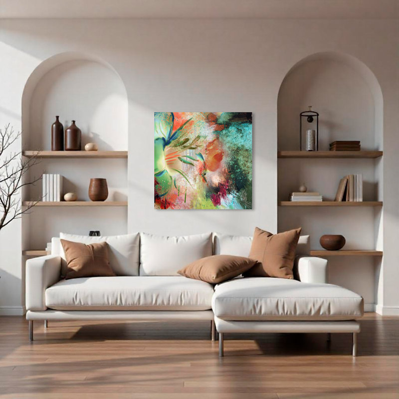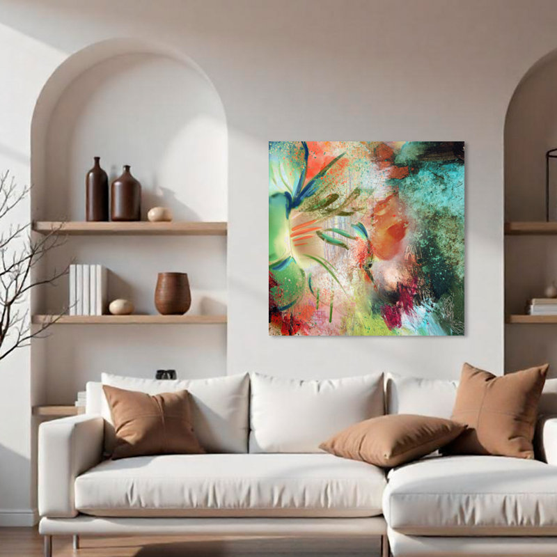 Painted Petals LIX by Tristan Scott – Wrapped Canvas Graphic Art Print is a gallery wrapped canvas that contains the abstract nature of flower just taking form. Blossoming into a world of complex states and tumultuous tempers, unyielding to its new environment, the flower bursts forth with glowing sheens – its petals green with wonder, its stamens red with passion.