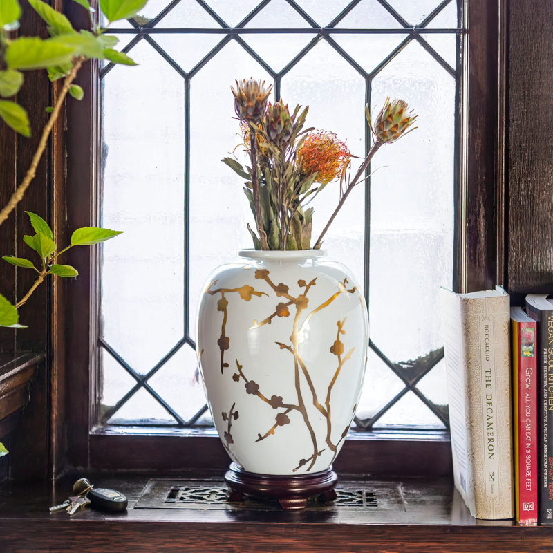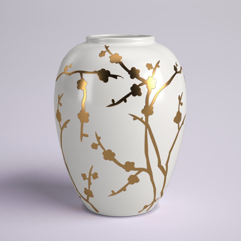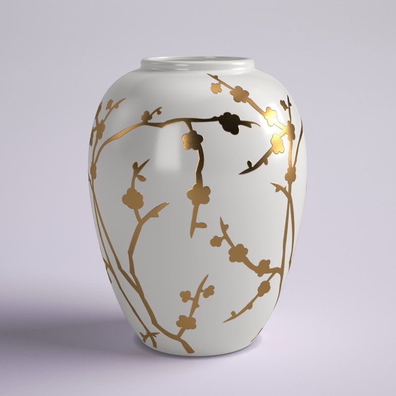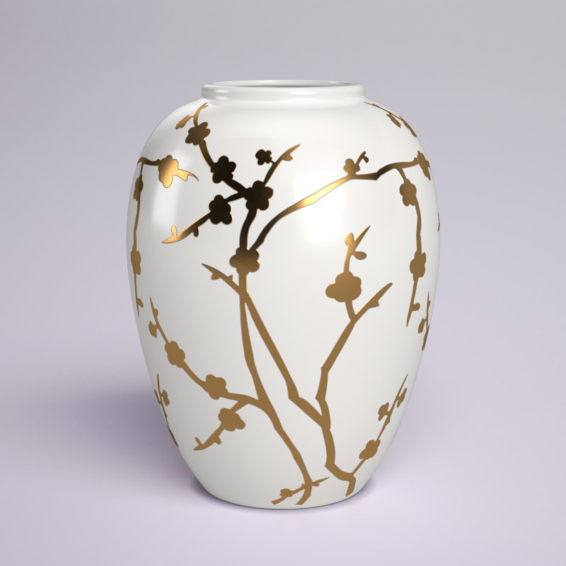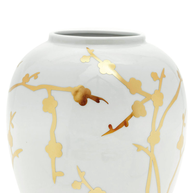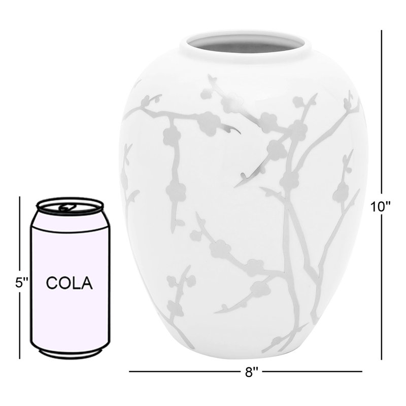 This table vase fills out your glam space with an elegant look. It’s hand-crafted from porcelain in a curving, round shape that tapers at the bottom and the top. The design features a white background and shining, golden-hued botanical patterns that offer texture and visual dimension. This table vase measures 10” high and around 8” wide. Add it to your dining room table, hallway sideboard, or bedroom dresser for some extra style. Safe for indoor or covered outdoor use.