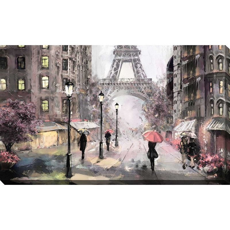Bring a taste of international travel to the comforts of your living room, bedroom, or home office with this reproduction painting. Originally entitled “Paris Streets II” by Lawrence Studios, this watercolor painting reproduction features a rainy Paris street scene with the Eiffel Tower in the background in shades of gray and pink. This rectangular piece is printed on canvas and wrapped around polystyrene stretcher bars. It’s easy to hang horizontally over your sofa, bed, or desk.