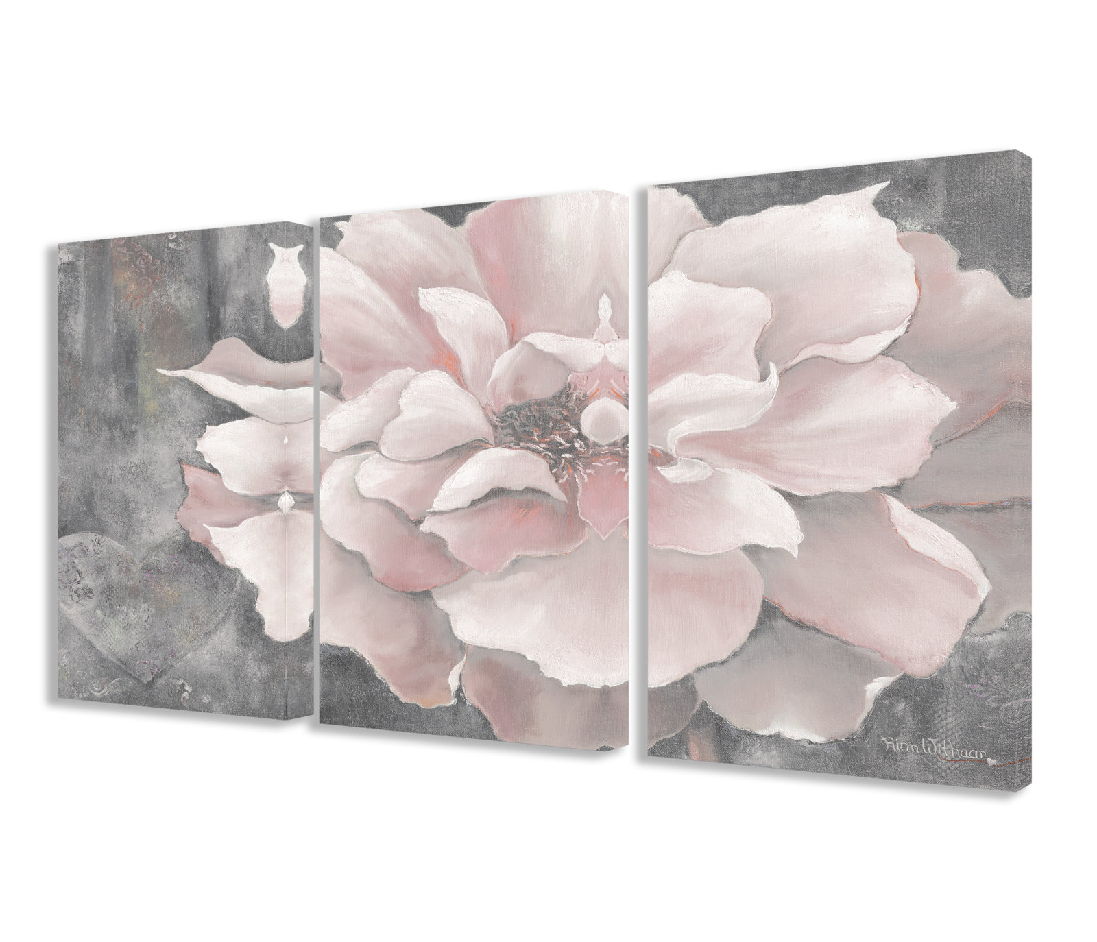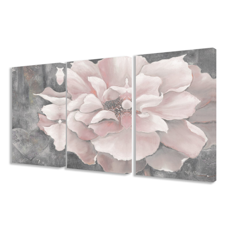 Spruce up any wide open space in your home with this three-piece painting print set, featuring a sizable combined 24″ H x 48″ W x 1.5″ D silhouette that makes a statement. Printed in the USA, these gallery-wrapped canvases showcase a pastel pink peony up against a contrasting gray background with a subtle heart on one side, offering a splash of color and a boost of botanical beauty. Best of all, they’re ready to hang as soon as they reach your front door.