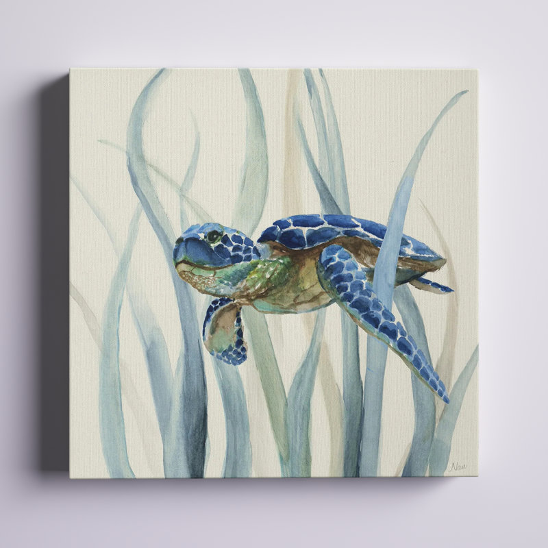 This breezy painting print brings plenty of coastal vibes and a splash of color to your beachy decor. Reproduced from an original art piece, this print showcases a sea turtle looking straight ahead as it swims through a tangle of underwater seagrass. This piece is printed in the USA on canvas with cool and calming hues of lime green, blue, and beige. It’s wrapped around a wooden frame for a gallery-worthy presentation. We love that it comes in several sizes to choose from that best suit your taste. Plus, it includes wall-hanging hardware for fuss-free installation.