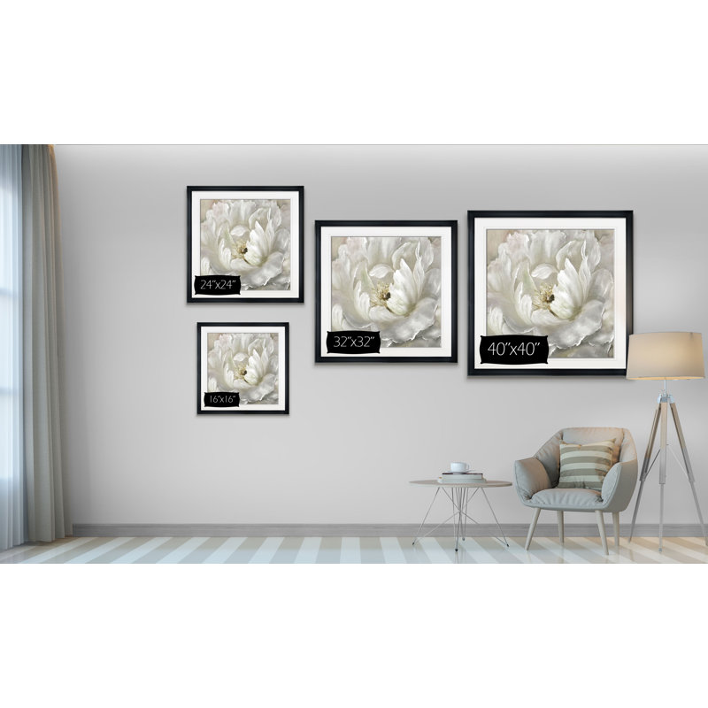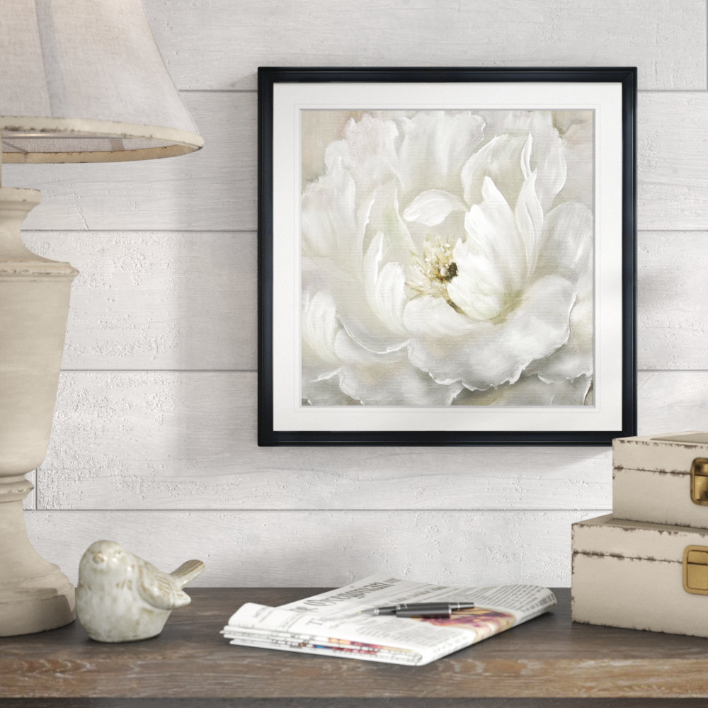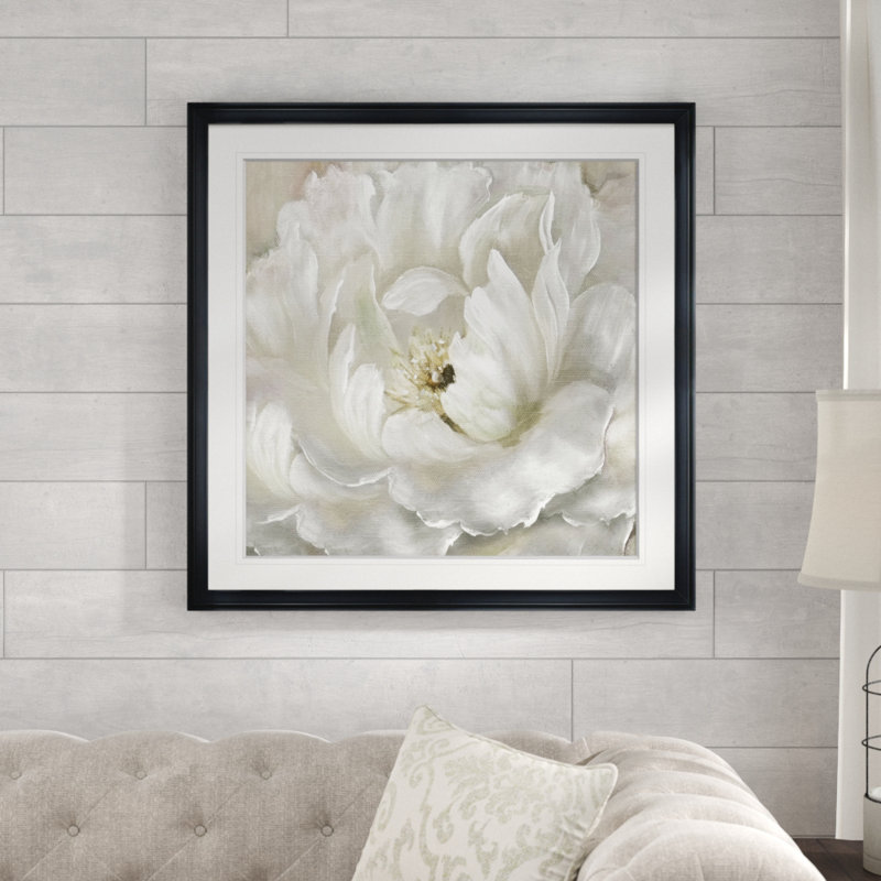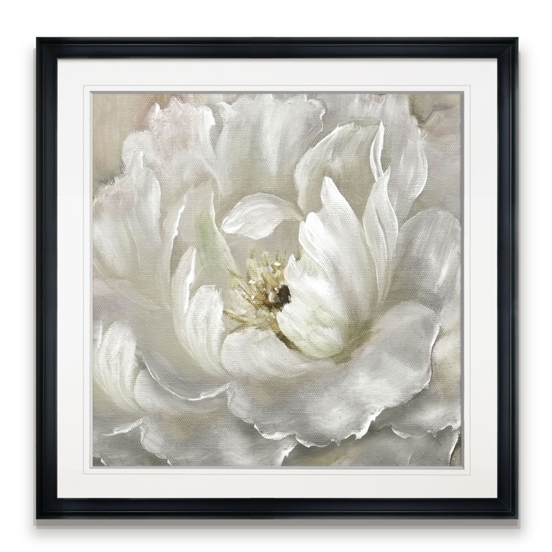 Bring serene botanical style to your space with this distinctive giclee print. Entitled “Perfect Peony,” this square acrylic painting is printed on cotton canvas and hand-stretched over a frame. It depicts an oversized peony blossom in shades of white and gray. This print is made in the USA. It includes mounting hardware, so it’s easy to hang. This piece creates a focal point over a sofa, bed, or dining room table in any modern or traditional home.