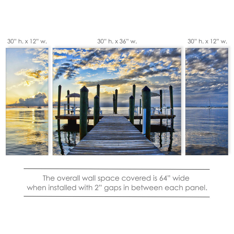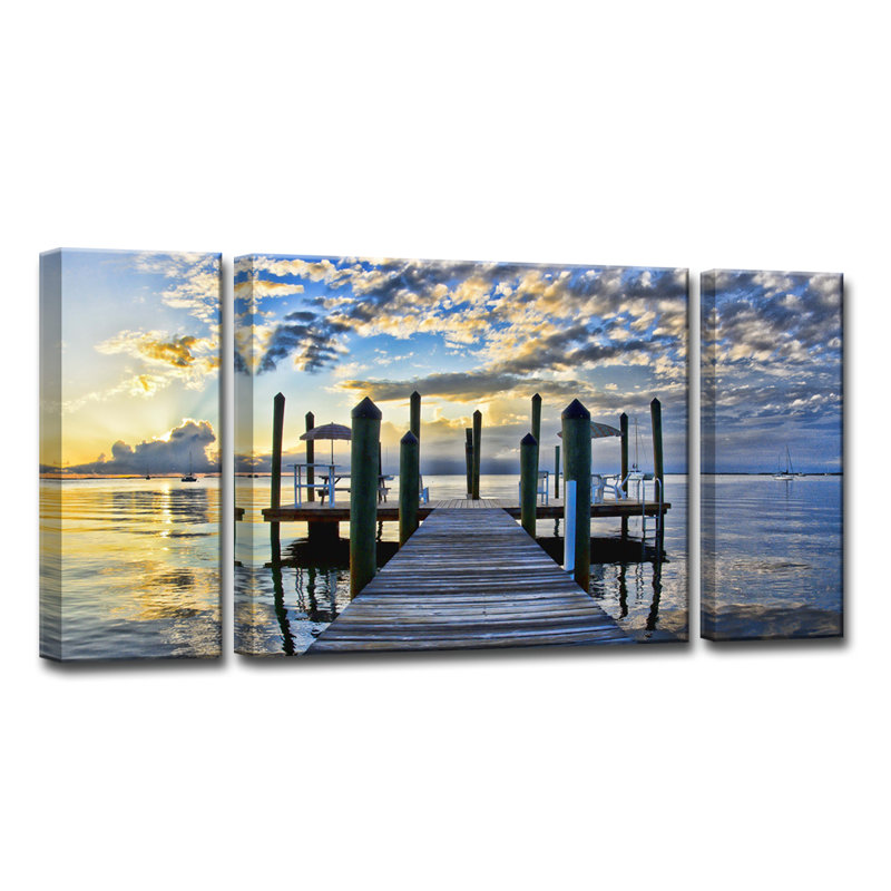 Add a little extra color and shoreline opulence to your home decor with this coastal blue-toned landscape photography canvas art set featuring a scenic sunset view from a boardwalk. The horizontal dec…. Read More.