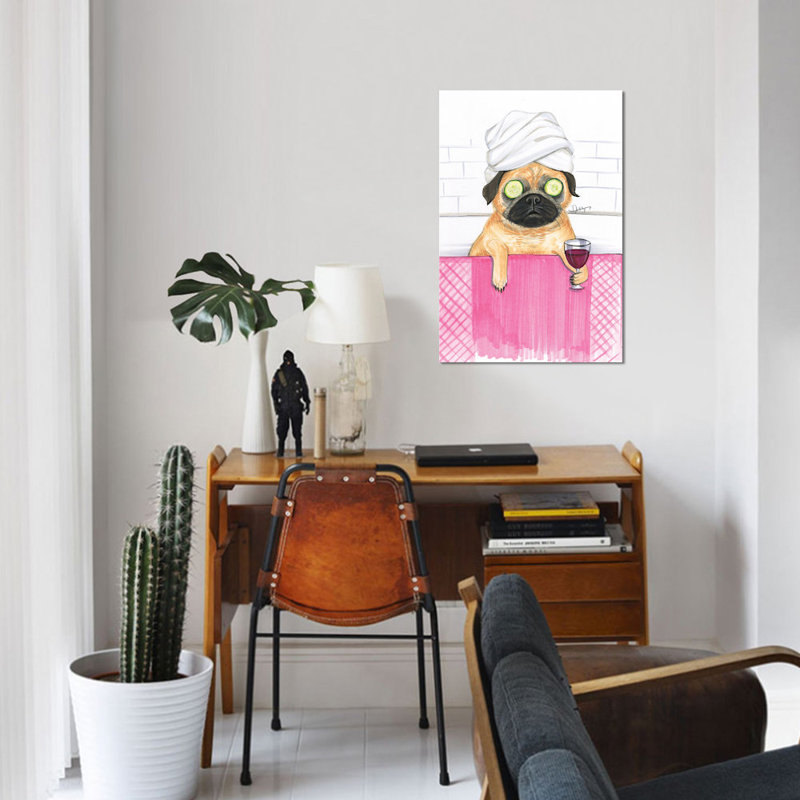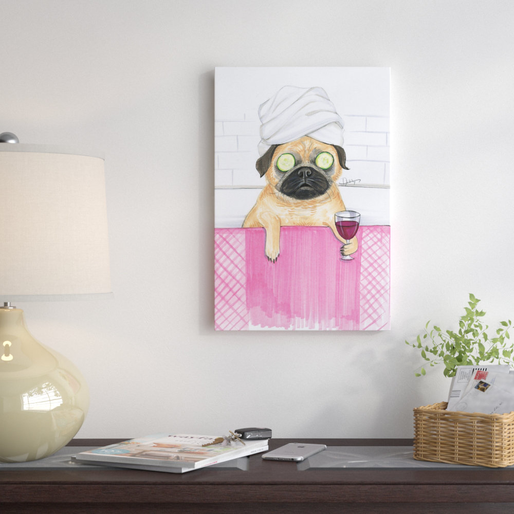 Add some fun flair to any wall in your home with this eye-catching art. Whether you want to add some whimsy to your classic space or round out your little one’s ensemble, it’s the perfect pick. It showcases a cute pug enjoying a spa day, with cucumber slices, a wrapped towel, a glass of red wine, and a pink mat. This artwork is crafted with 100% cotton artist-grade canvas that is professionally hand-stretched and stapled over pinewood bars in a gallery wrap style.