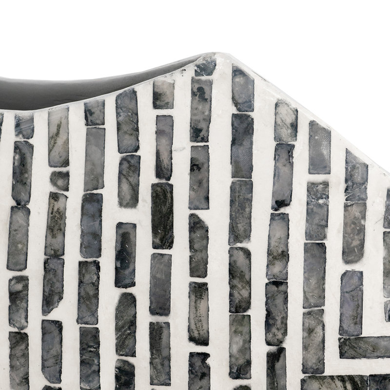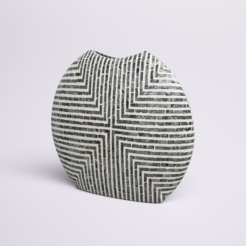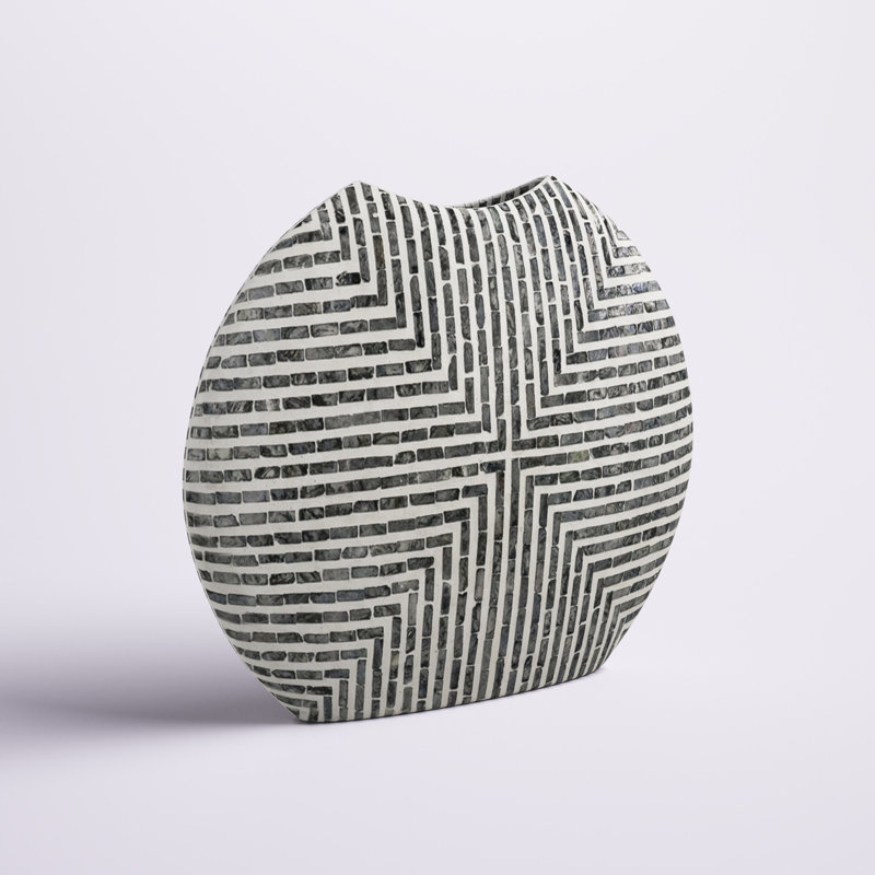 Add a geometric look to your space with this novelty vase. Crafted from 80% Paper Powder, and 20% Capiz, it features a circular silhouette with a shallow width for a dynamic look and a flat bottom, so it balances on your tabletop or mantelpiece. A linear inlay pattern shows off neutral hues that strike an eye-catching, neutral effect in your space. Plus, it has a cut-out opening for your real or imitation flowers. We love that this vase works as a functional piece but stands out on its own as a visual accent.
