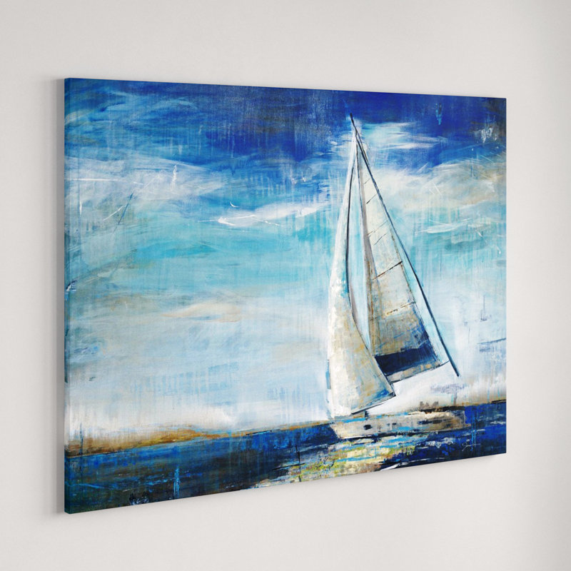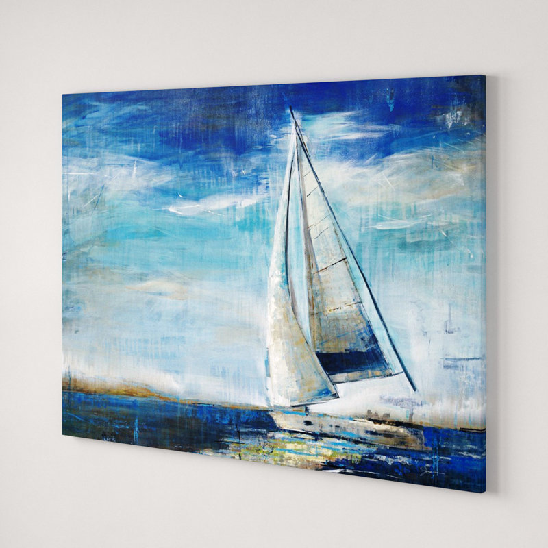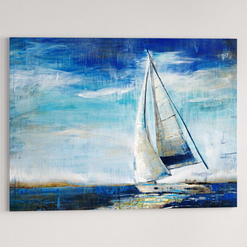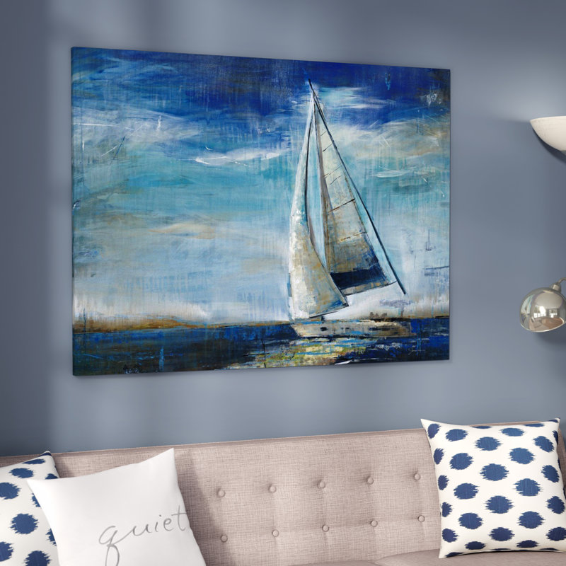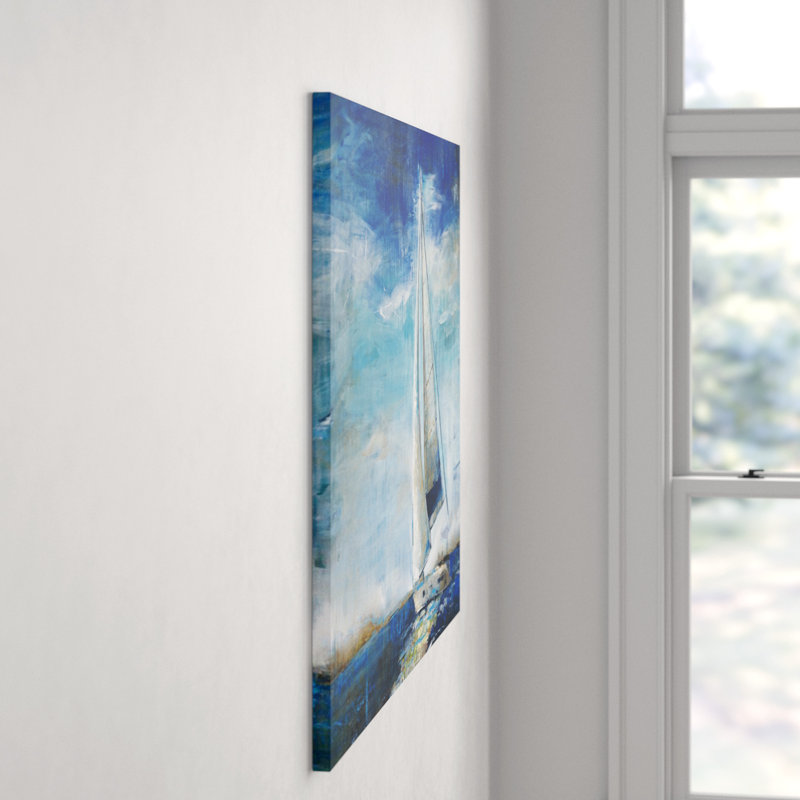 Is space starting to feel stale? Mix a splash of nautical style into any arrangement with this peaceful painting print. Right at home in beach abodes and coastal ensembles, it showcases a lone sailboat afloat on calm ocean waters. Bright blue, white, gray, beige, and black tones outfit this design for a pop of color. Proudly made in the USA, this rectangular piece is printed using archival inks and a protective UV coating to help its hues stay crisp.