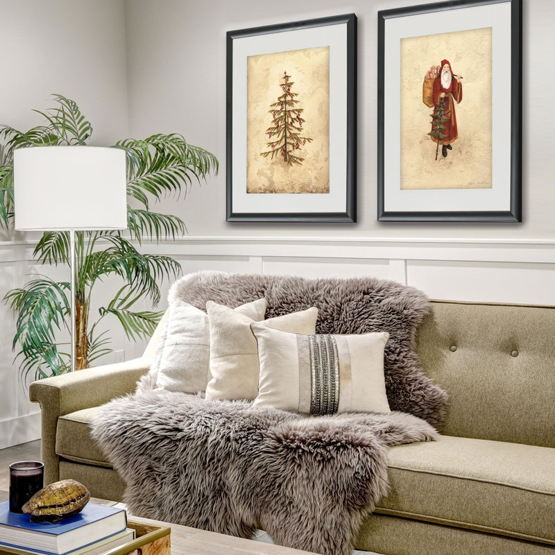 This 2-piece art print set completes your space swapping an empty blank wall with holiday cheer. Originally an acrylic painting, each is printed with premium inks on satin fine art paper for a gallery-worthy aesthetic. The distinct but coordinating designs feature a rustic Santa with a pack of presents and the other a rustic Christmas tree, both against a vintage-inspired brown background. We love that this wall art set comes with mounting hardware, so it’s ready to hang and style right out of the box.
